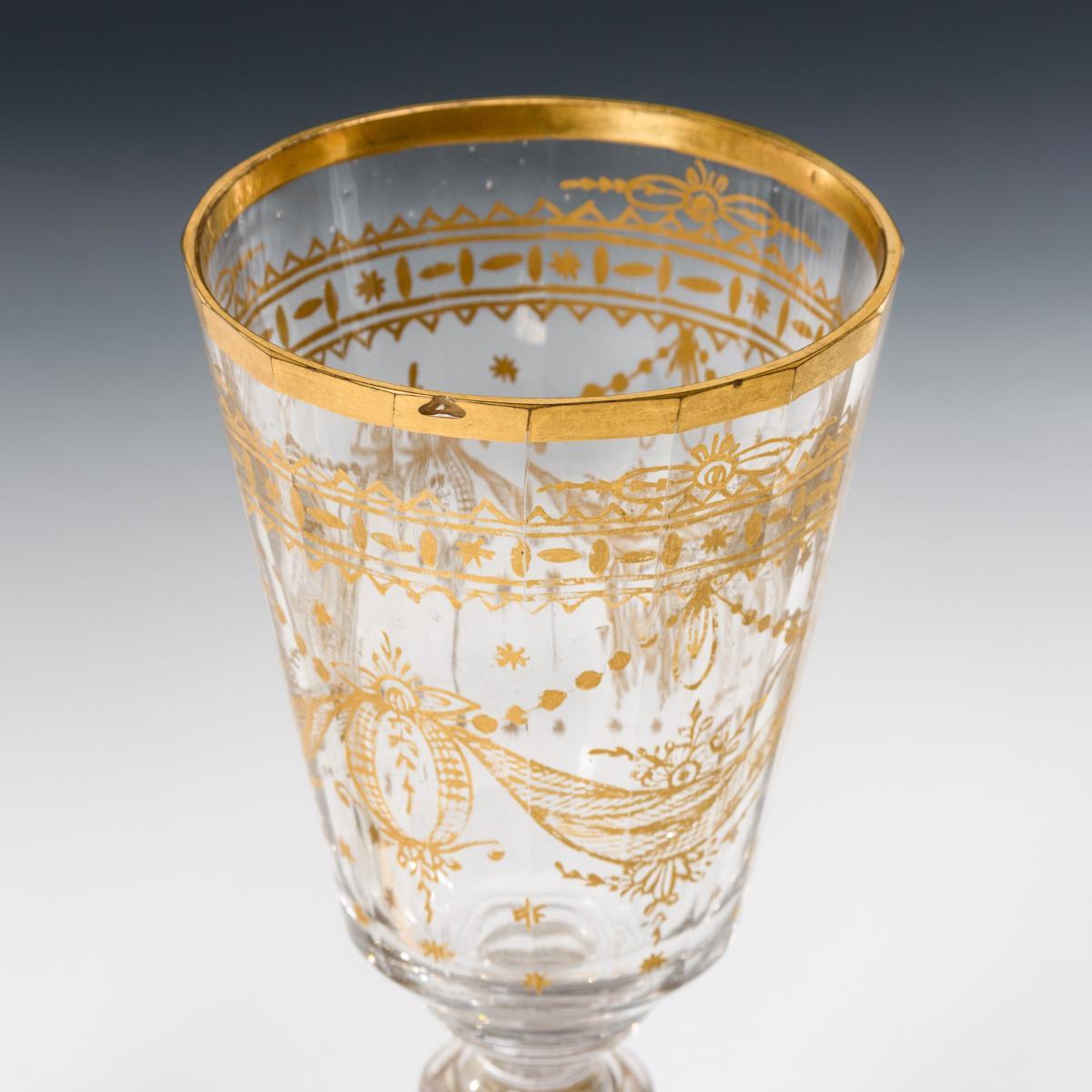 Farbloses Glas mit goldgemalten Girlanden und Ornamenten.