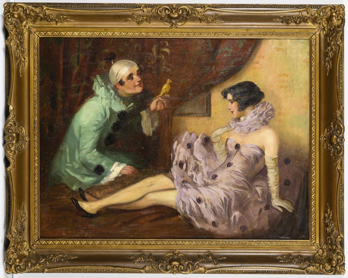 Genre scene of the two figures with singing bird. Minimal traces of age.