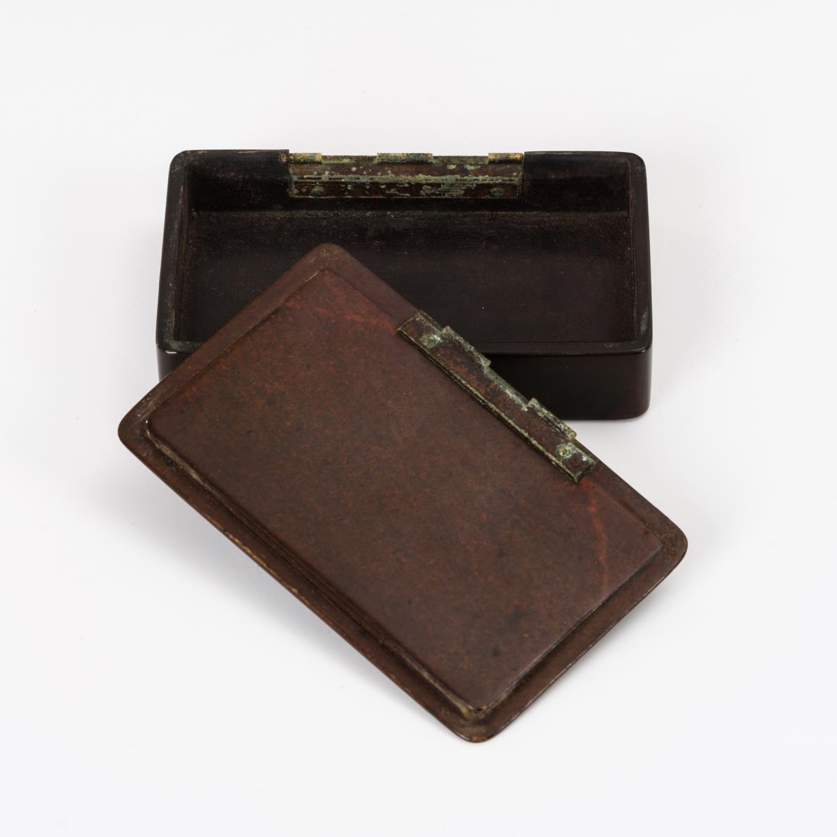 Papiermaché im dunklen Rotbraun lackiert, Scharnierdeckel polychrom bemalt.