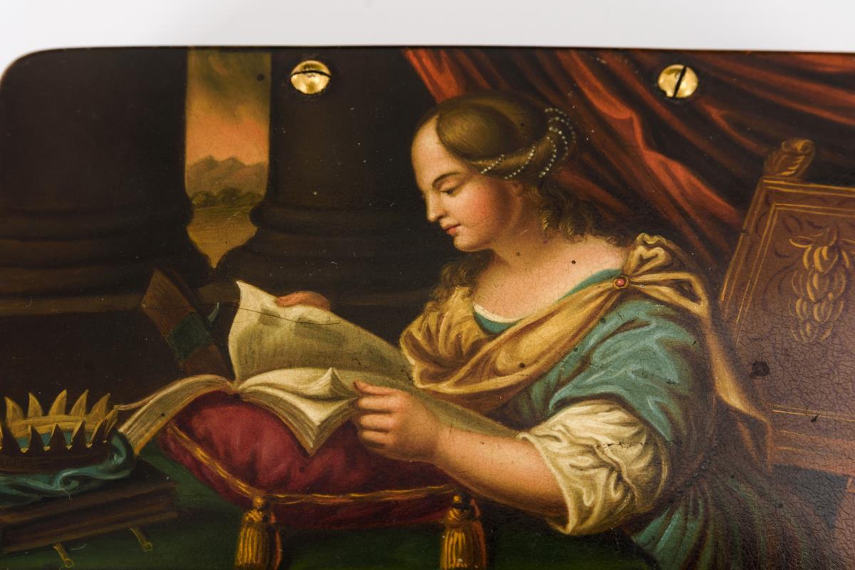 Lackdose mit lesender Frau.