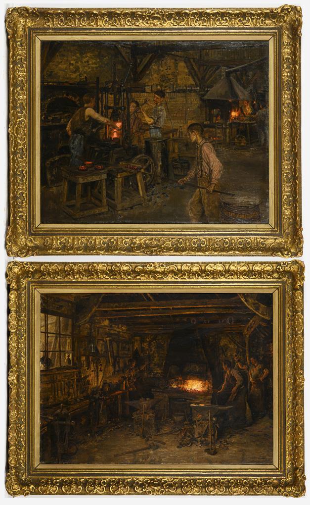 Workers at the fire and in the heat of the forge as well as glassblowers working on the glowing glass. Each trimmed canvas.
