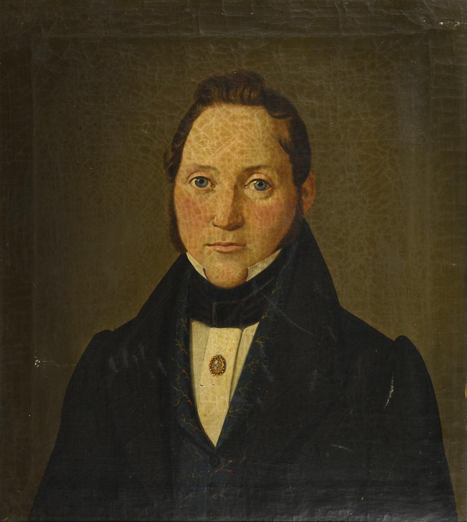 Portrait of a man in a black frock coat with stand-up collar against a neutral background and portrait of a woman with curly hair and in a dark dress. In need of cleaning, scratches.