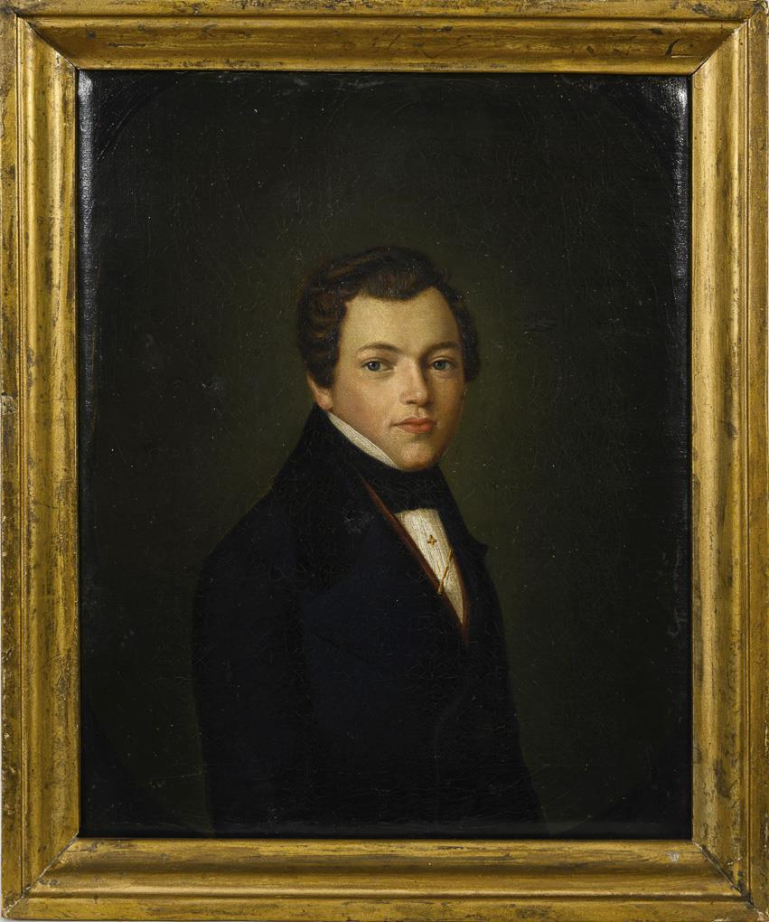 Portrait of a young man in a dark blue frock coat against a neutral background. Signs of age.