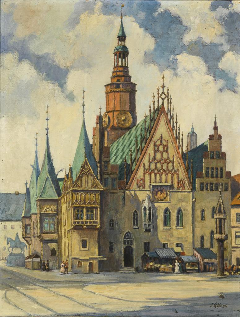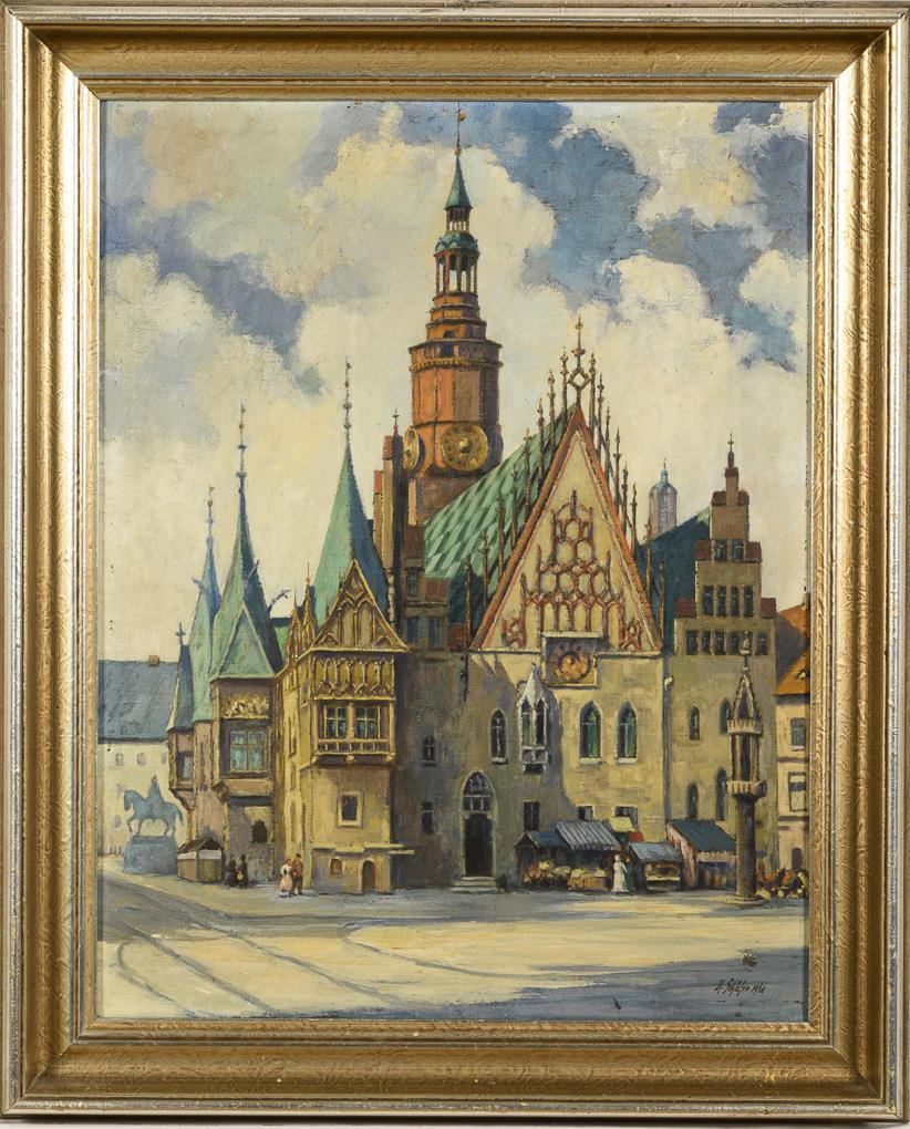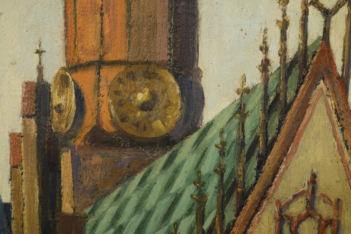 Staffage figures in front of the Gothic building in the sunshine under a slightly cloudy sky. Minimal traces of age.