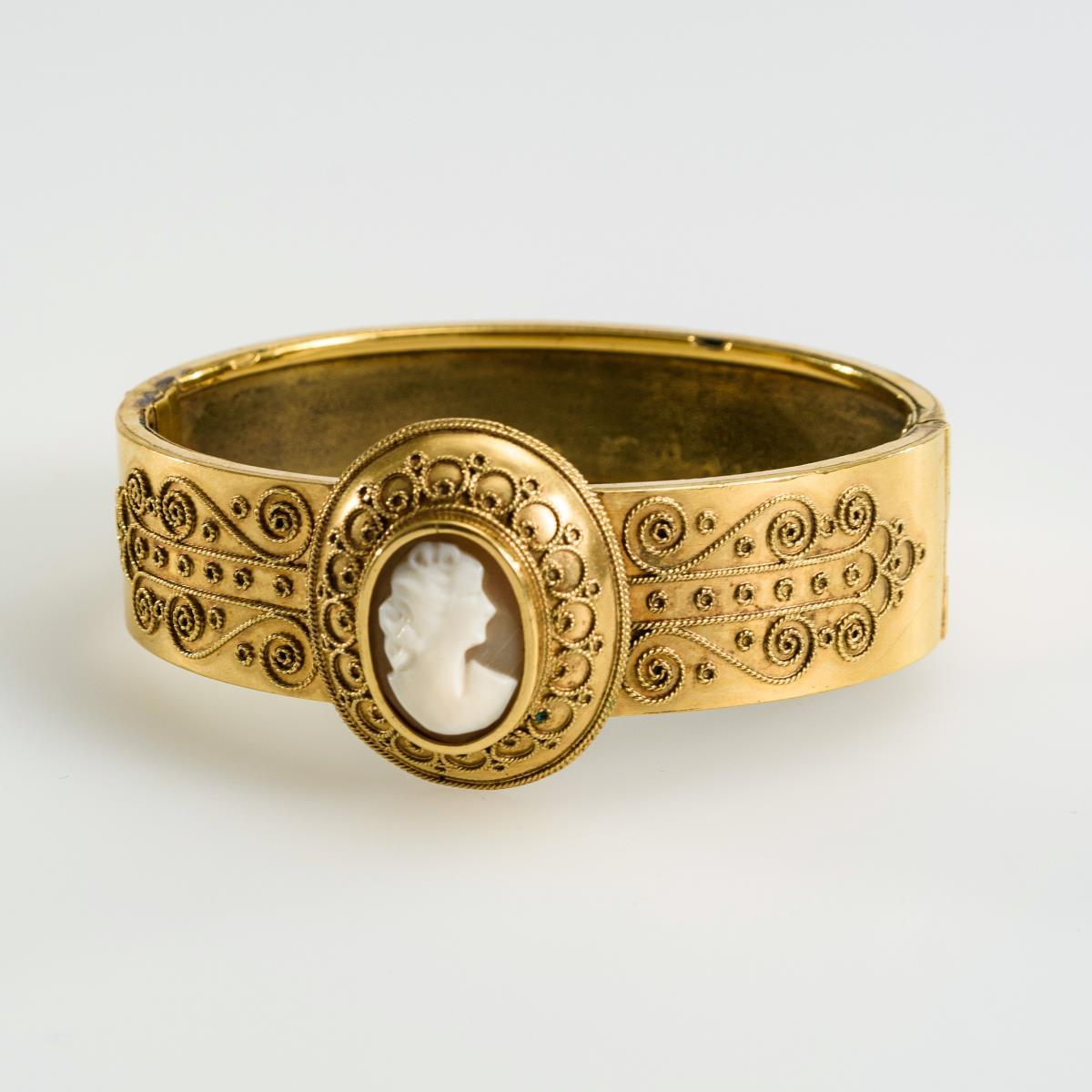 Muschelkamee mit geschnittenem Frauenprofilkopf. Kastenschloss.