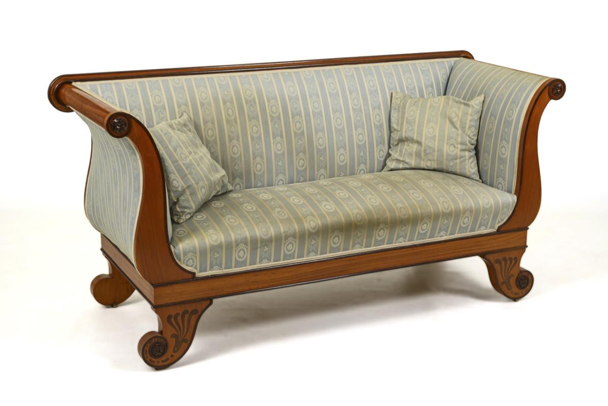 Simple, 2-seater sofa on wheels with volute armrests and feet; horsehair upholstery with light blue-champagne colored cover with typical style pattern. Veneer with slight signs of age/use, cover soiled.