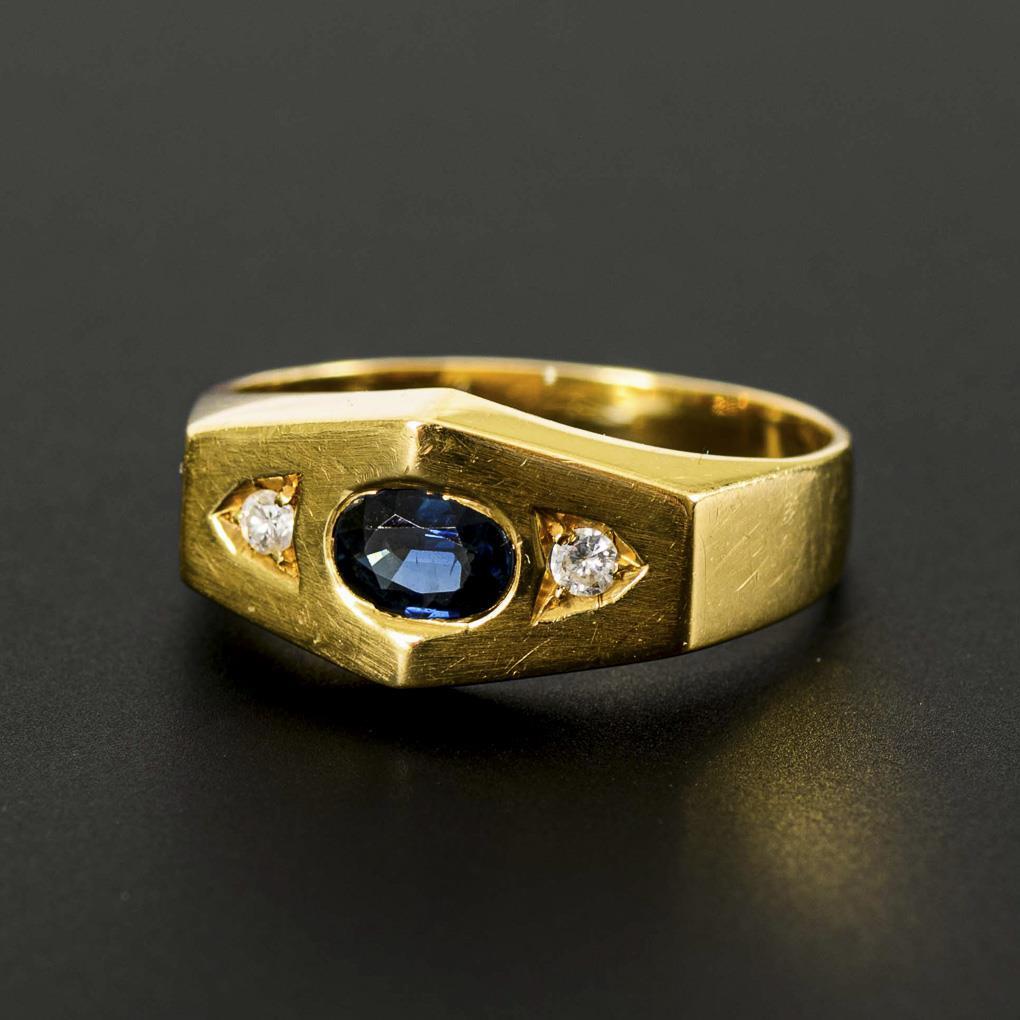 Sapphire set in the wide center and 2 small brilliant-cut diamonds. Medium rail.