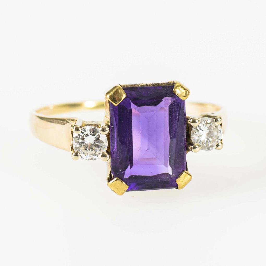 Claw-set amethyst and 2 chaton-set brilliant-cut diamonds between narrow shank.