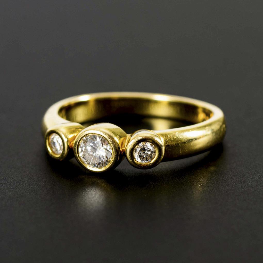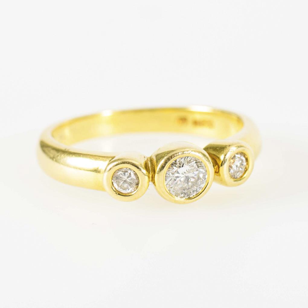 Marked yellow gold 585. Brilliant-cut diamonds 1 x 0.40 ct. G-H/PI-PII. 2 x 0.20 ct. G-H/si-PI. Ring size 60. 5.4 g.