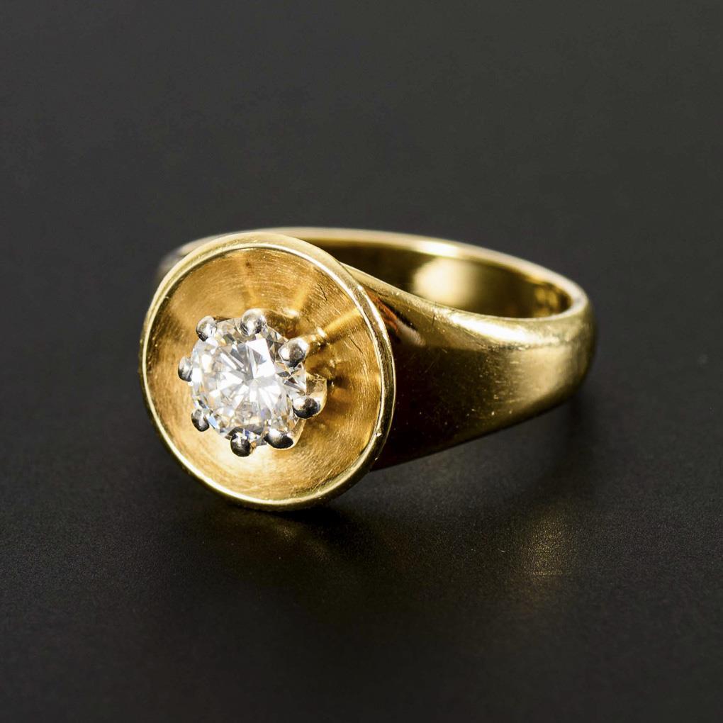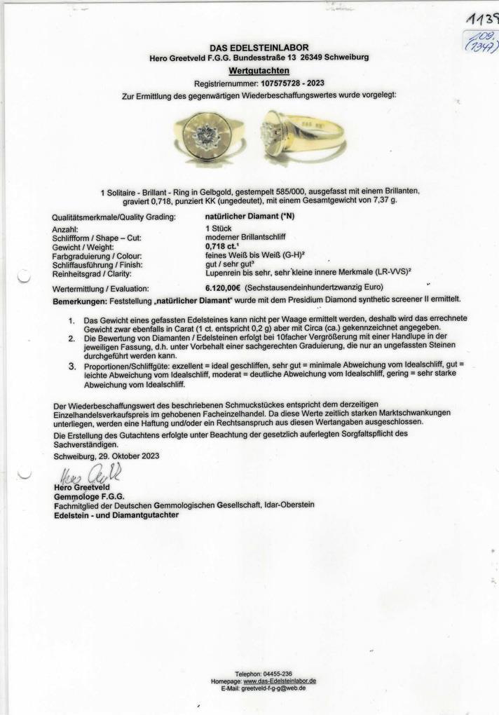 Marked yellow gold 585. Brilliant 0.718 ct. G-H/lr-vvs. ring size 57. 7,4 g.