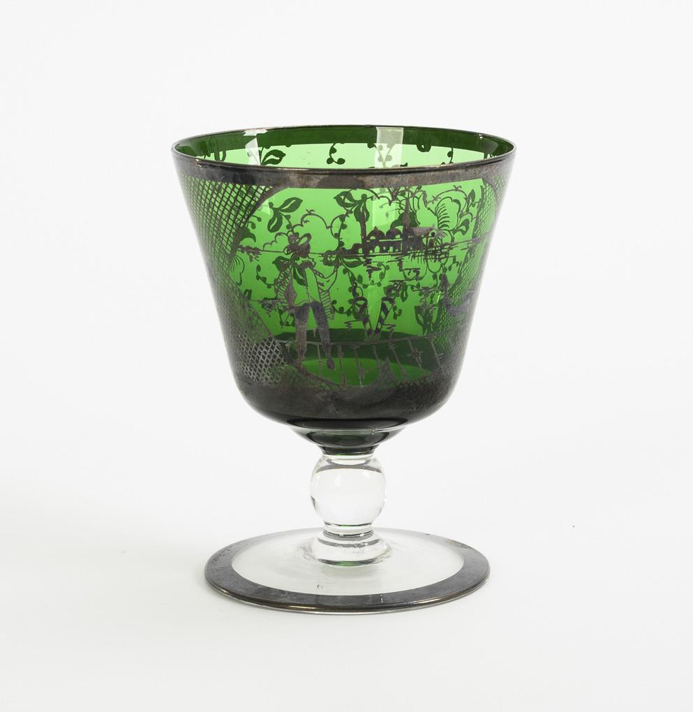 Conical bowl of green glass, nodus stem and round foot of clear glass. Silver-painted Venetian motifs, grillages and floral decoration on the dome.
