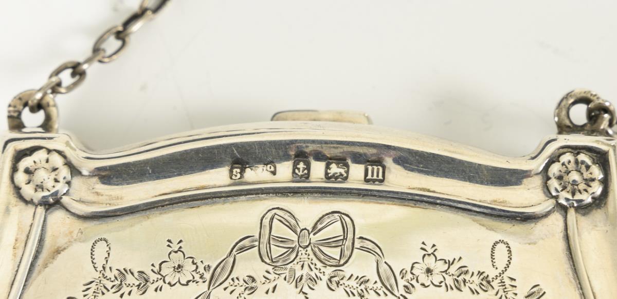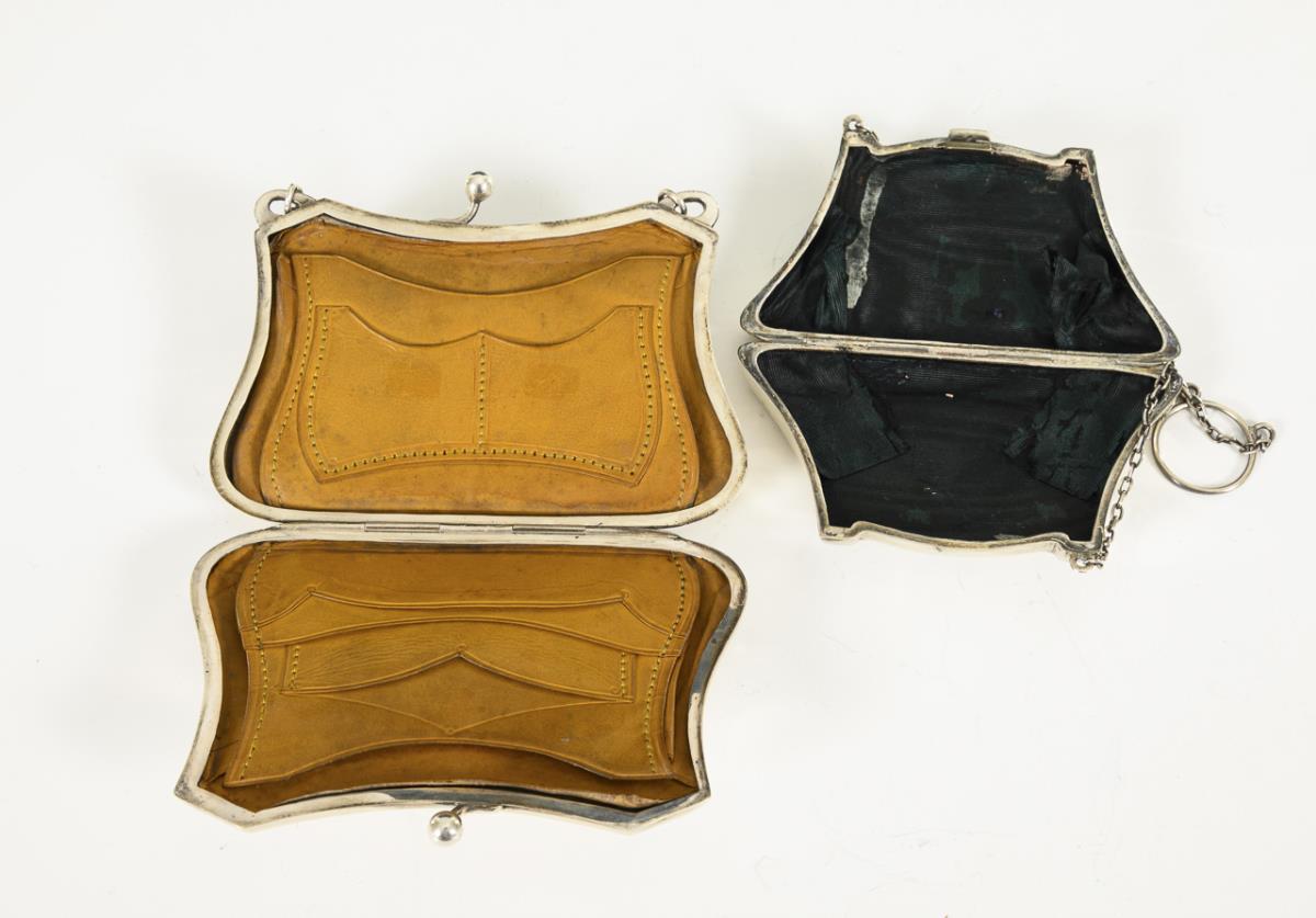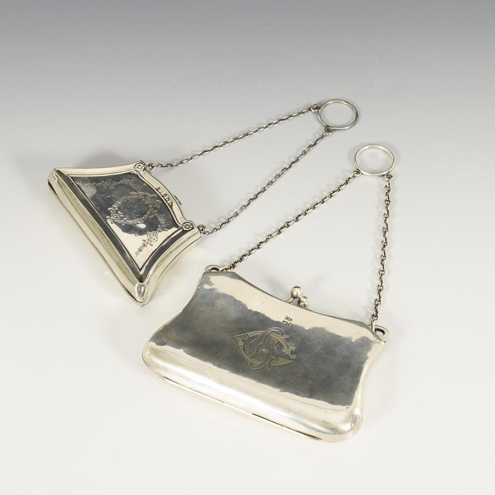 Elegant cases on short chain. 1x with flower garlands, 6 x 10.5 cm. 1x with monogram engraving "CG", 8.5 x 12.5 cm. Signs of wear, dents, 1x inner lining defective.
