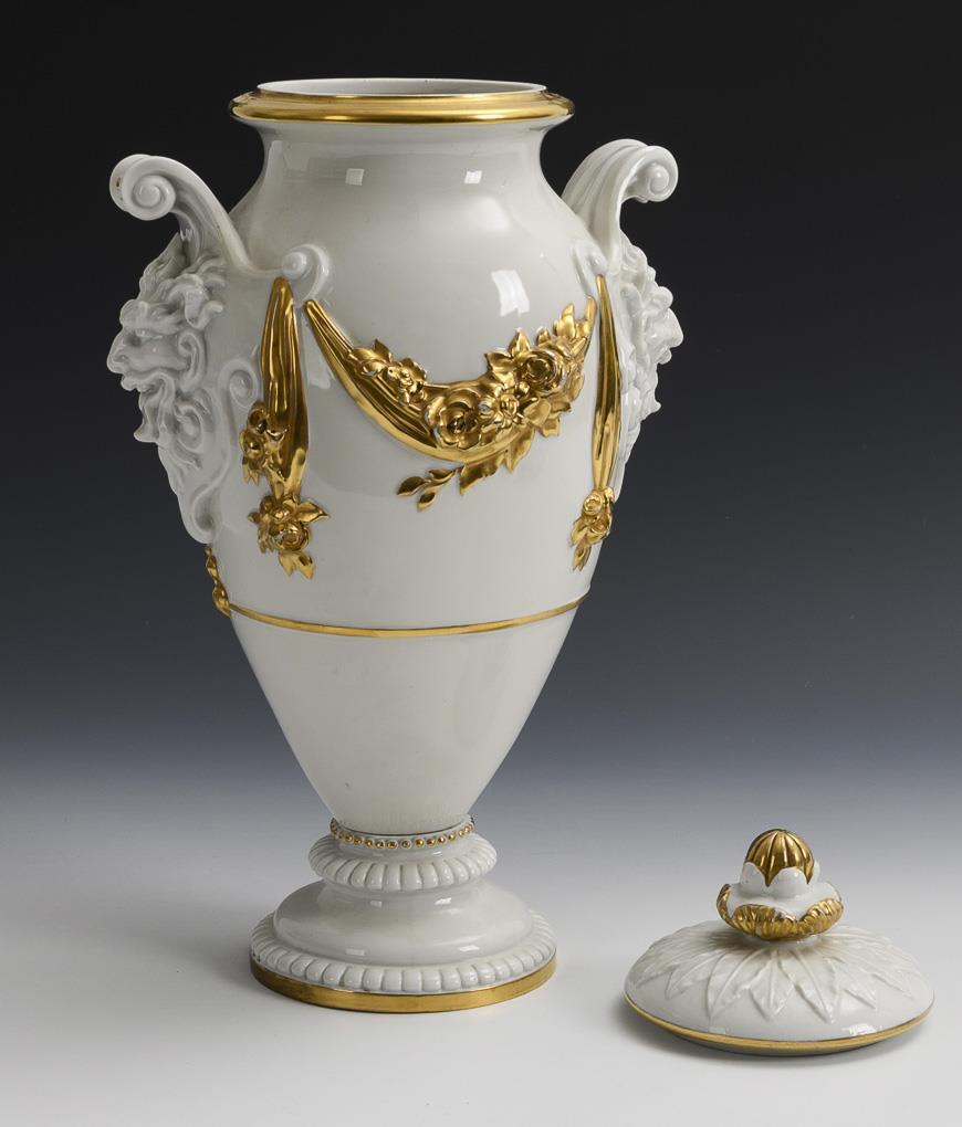 Ovoid body with mascaron handles, bud finial lid and round foot. On both sides a drapery in relief with flowers. Minimal gold abrasion.