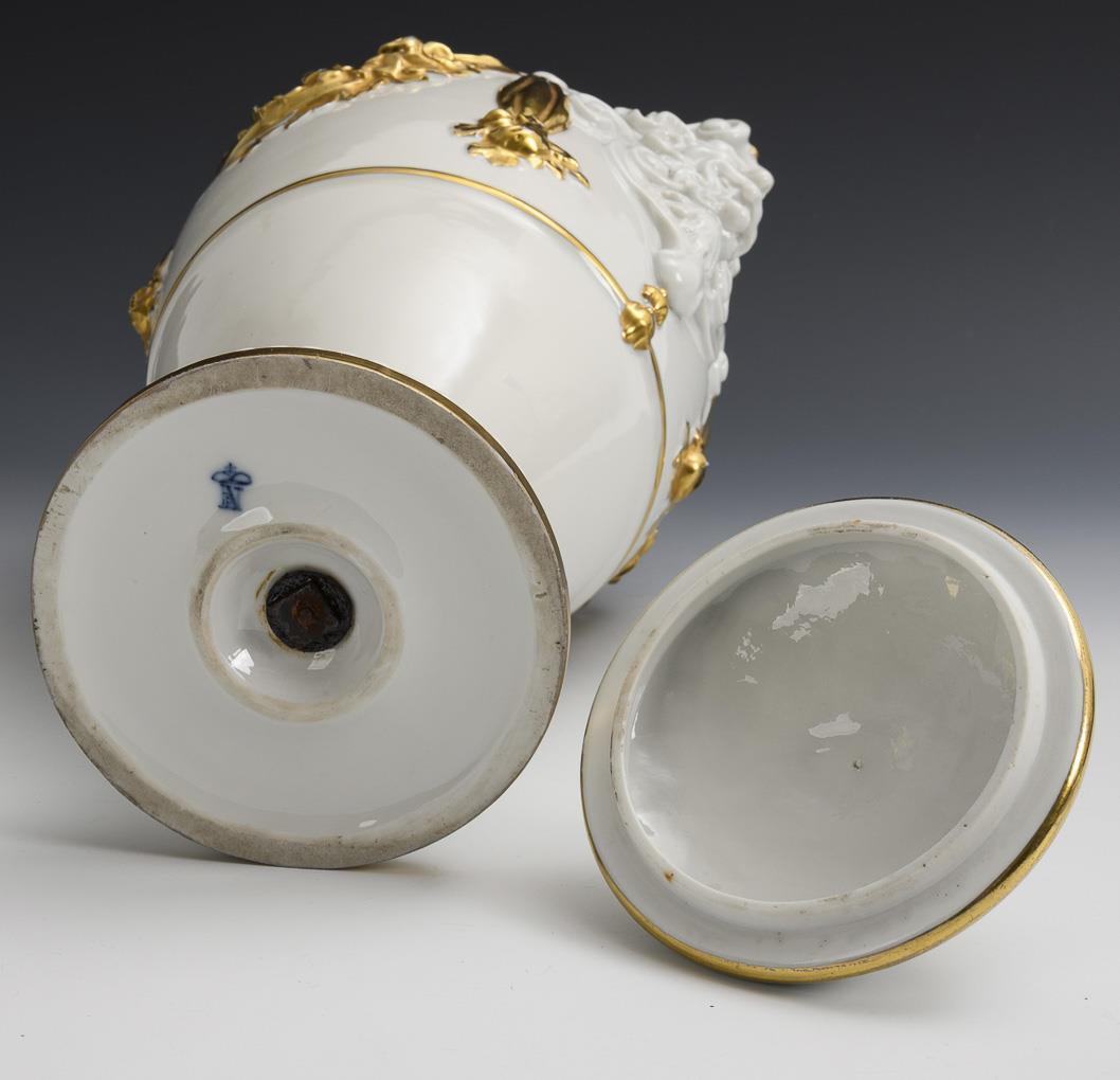 Ovoid body with mascaron handles, bud finial lid and round foot. On both sides a drapery in relief with flowers. Minimal gold abrasion.