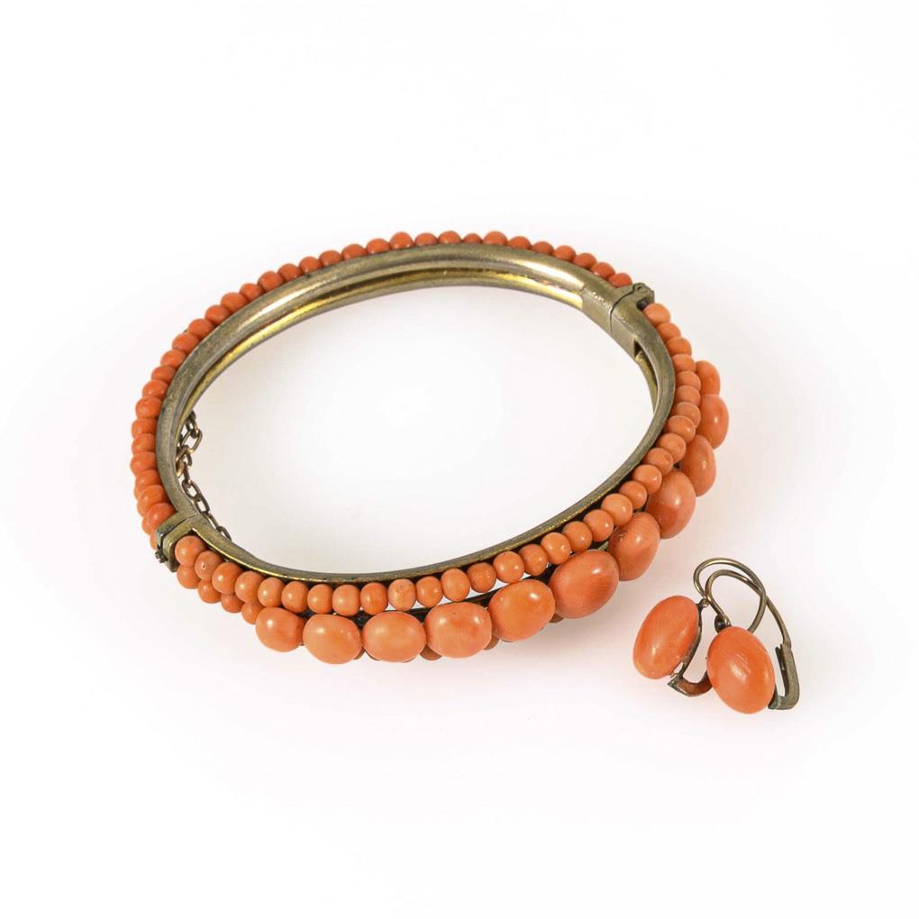Oval hinged bangle with coral beads and lenses. Box lock with safety chain. Earrings with coral on bail hooks.