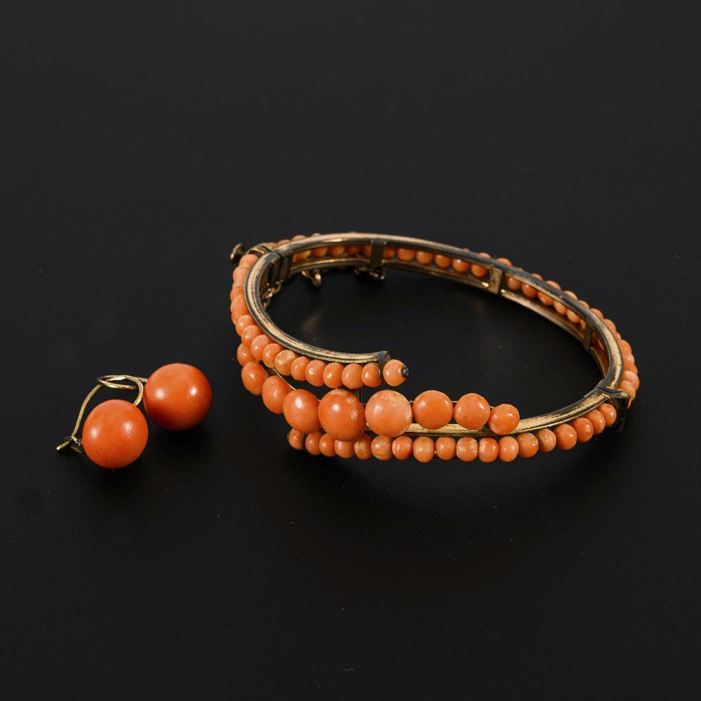 Oval hinged bangle with coral beads and lenses. Box lock with safety chain. Pair of earrings with coral on hook with safety catch.
