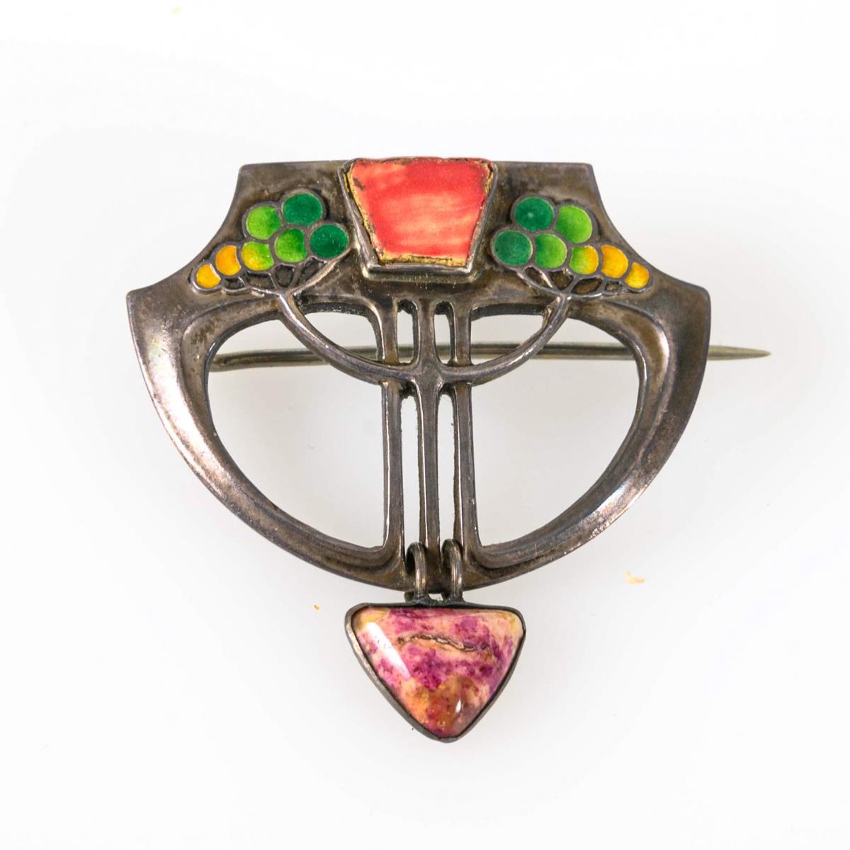 Typical style brooch with partial enamel decoration. Hook clasp.