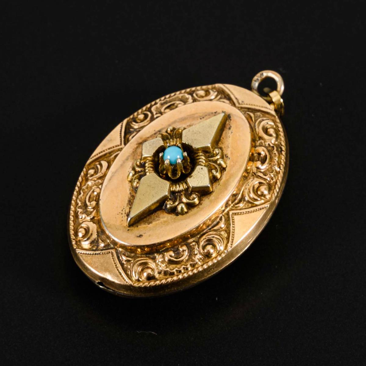 Relief pendant with ornamental mounting and small turquoise cabochon.