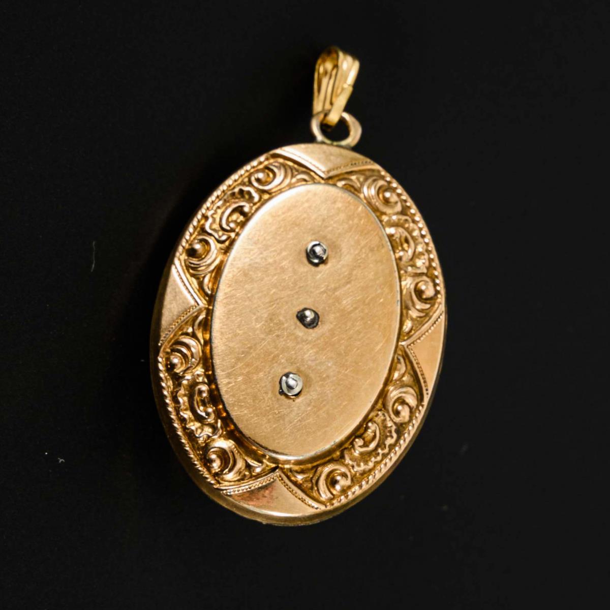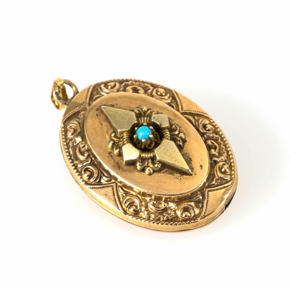 Relief pendant with ornamental mounting and small turquoise cabochon.