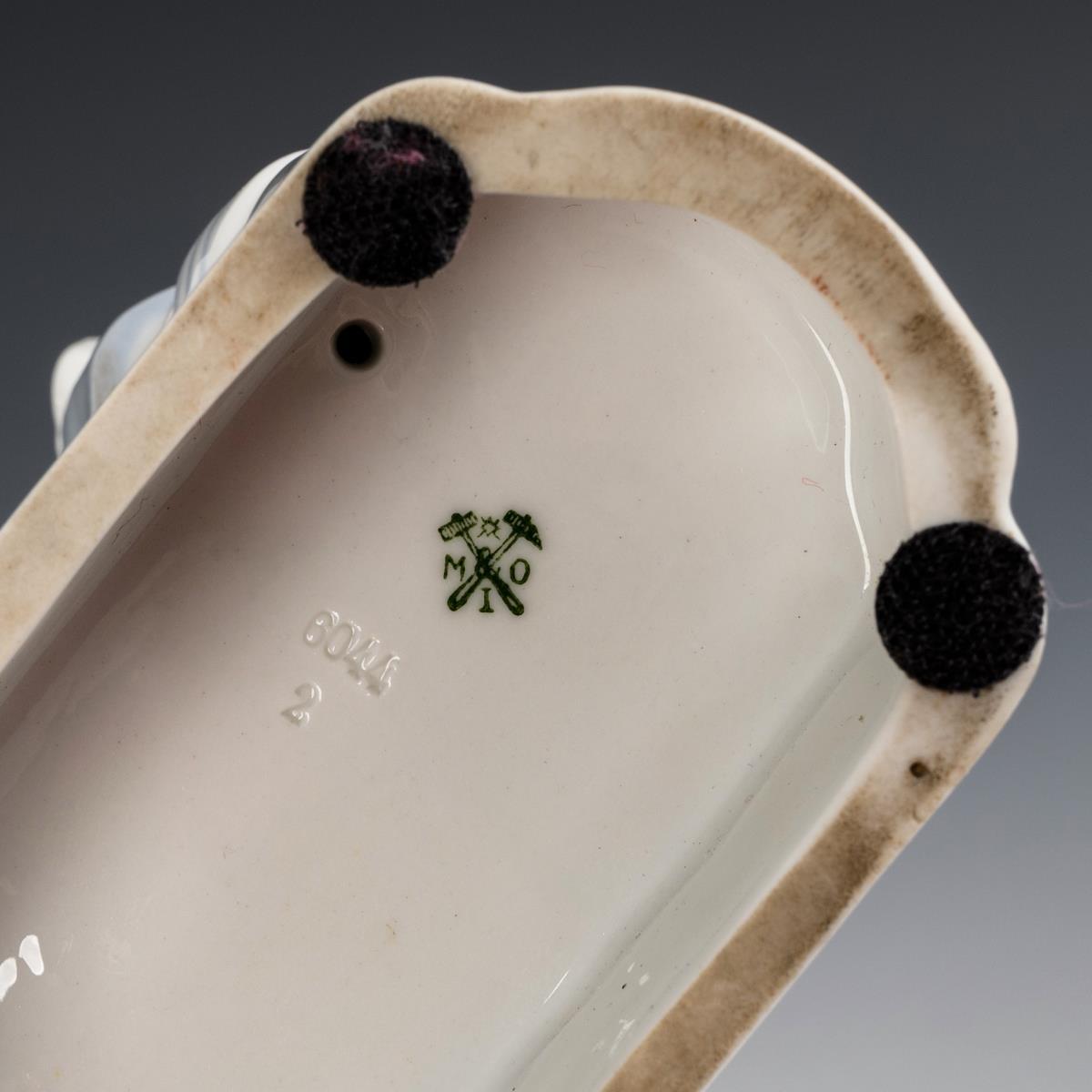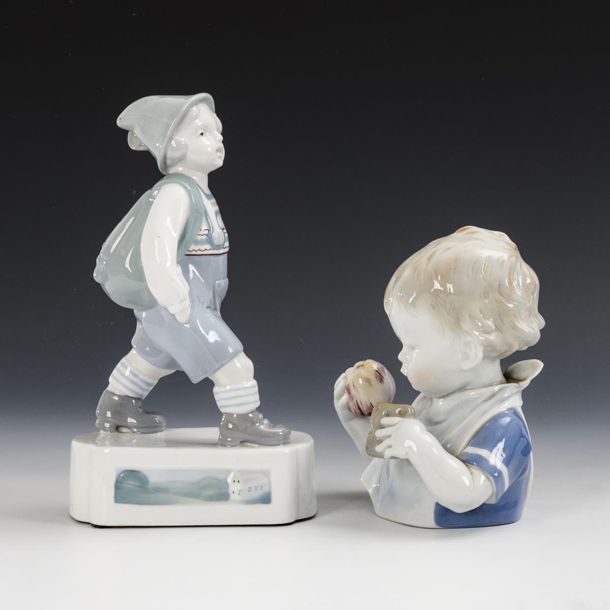 1x model no. 6044, design by Carl Nacke (1876-1931), marked: Boy as wanderer on a plinth with mountain landscape in relief (H 24 cm). / 1x model no. 6990, monogrammed "R.S.": Boy with apple and cheese (H 16.5 cm). Leaf of the apple missing.