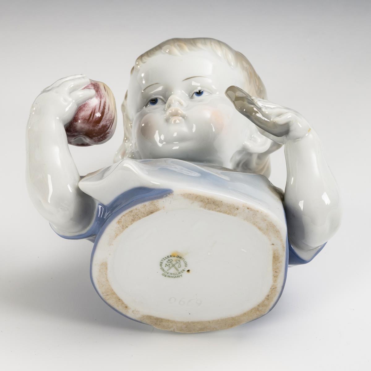 1x model no. 6044, design by Carl Nacke (1876-1931), marked: Boy as wanderer on a plinth with mountain landscape in relief (H 24 cm). / 1x model no. 6990, monogrammed "R.S.": Boy with apple and cheese (H 16.5 cm). Leaf of the apple missing.