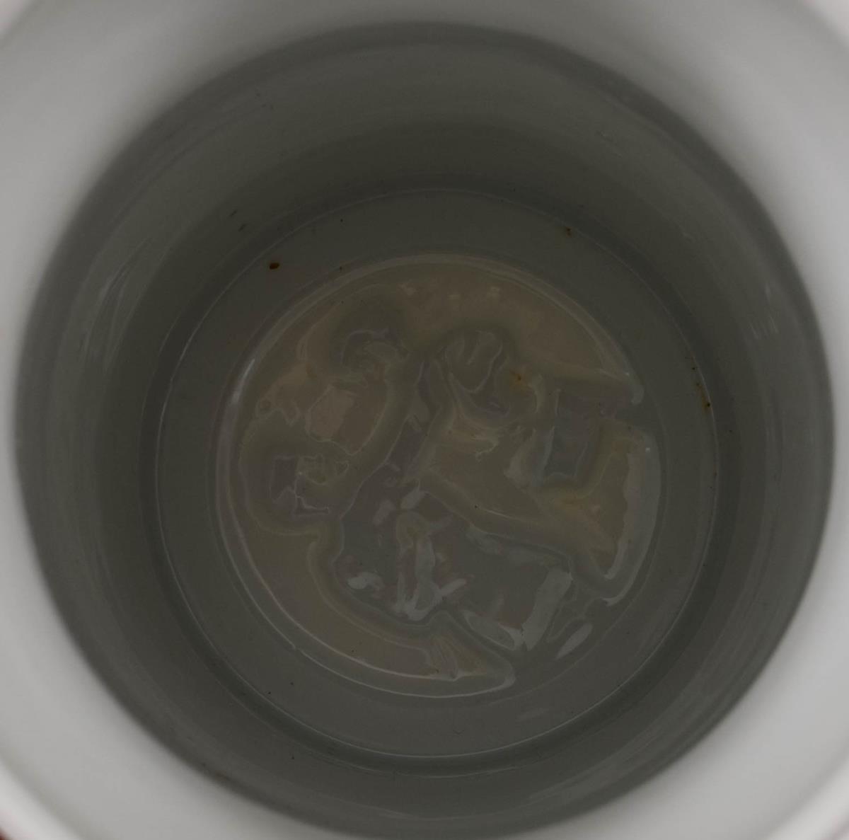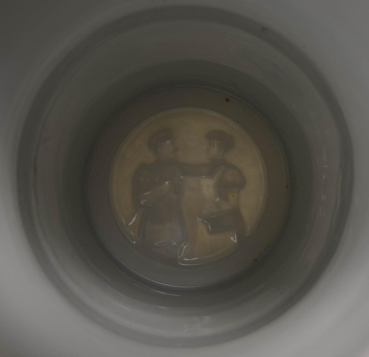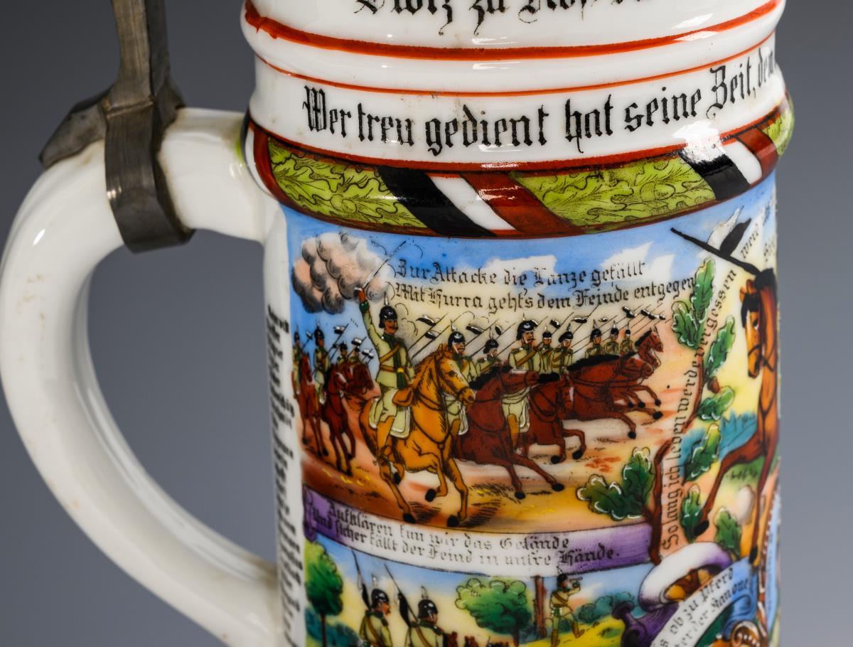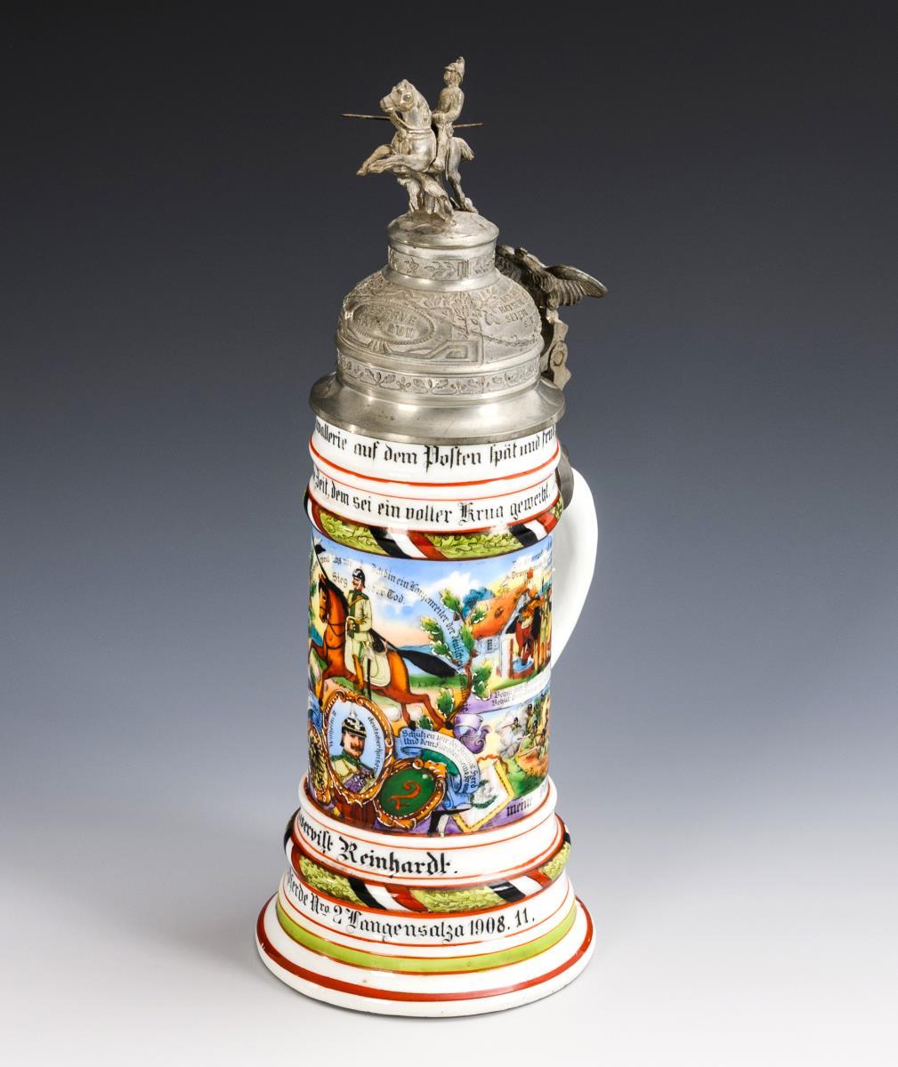 Jug with profiled base and numerous soldier scenes (in the center Kaiser Wilhelm II and lancers). Pewter lid in relief with eagle pusher and lancer. A magnifying glass miniature (Stanhope) with a reservist scene in the horse's head. "2nd Esk. Jäger zu Pferde Nro. 2", "Reservist Reinhardt", printed list of names. Micrograph somewhat damaged.