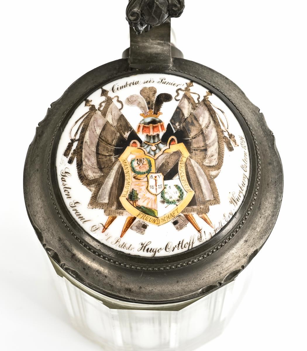 Solid oak casket with ornamental zinc appliqués and frosted glass pane with gold painting in the hinged lid: coat of arms of the Würzburg fraternity Cimbria. Dedication plaque Erlangen 1899 / Faceted half-liter glass jug with bottom star and pewter lid with lion as coat of arms holder and painted porcelain plaque (coat of arms Cimbria, dedication Würzburg 1894). / New glass jug with imprint "Gaudeamus" and pewter lid. Casket: lid slightly warped, few dry cracks. Old jug with chips to the stand, pewter loose.