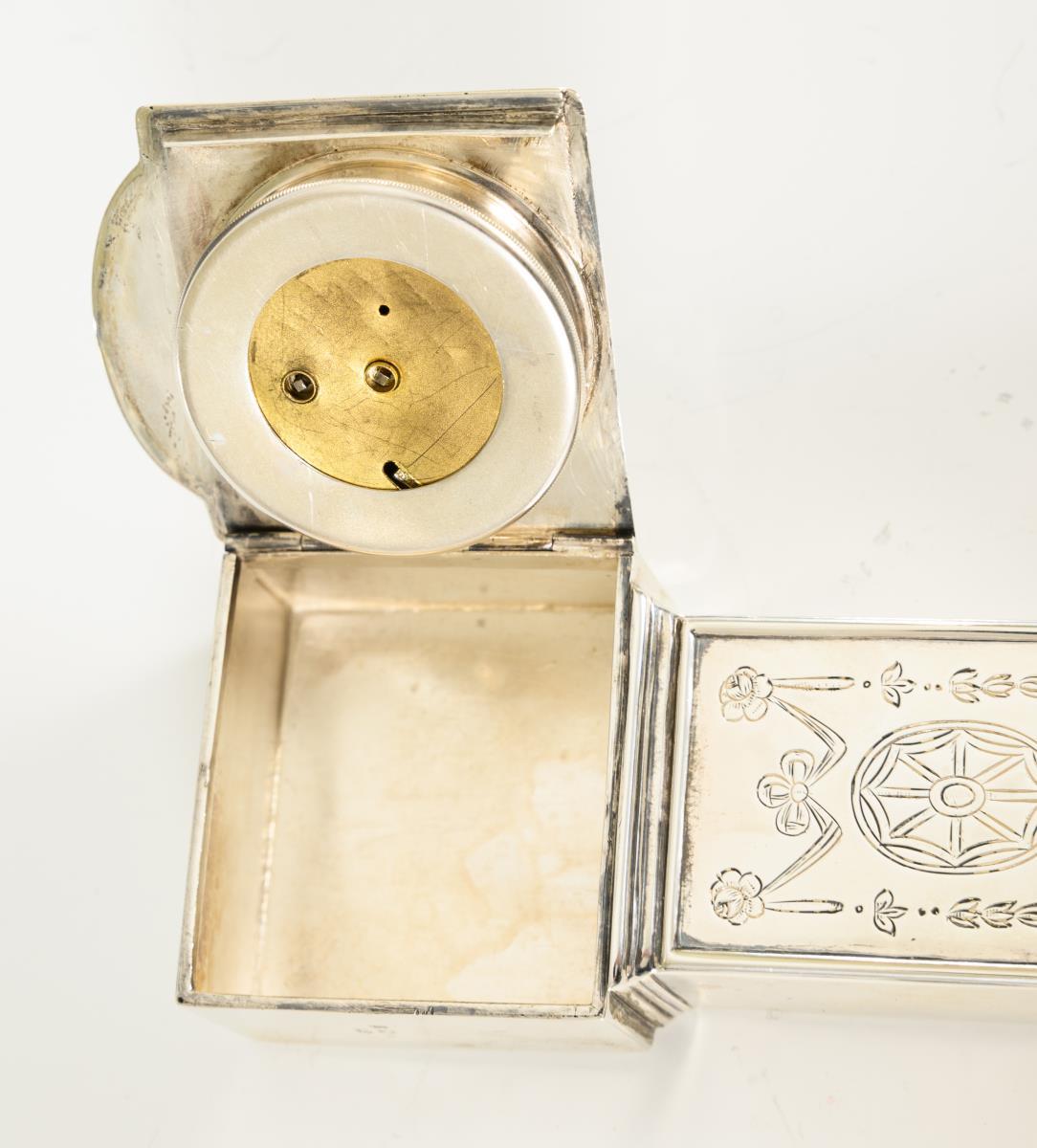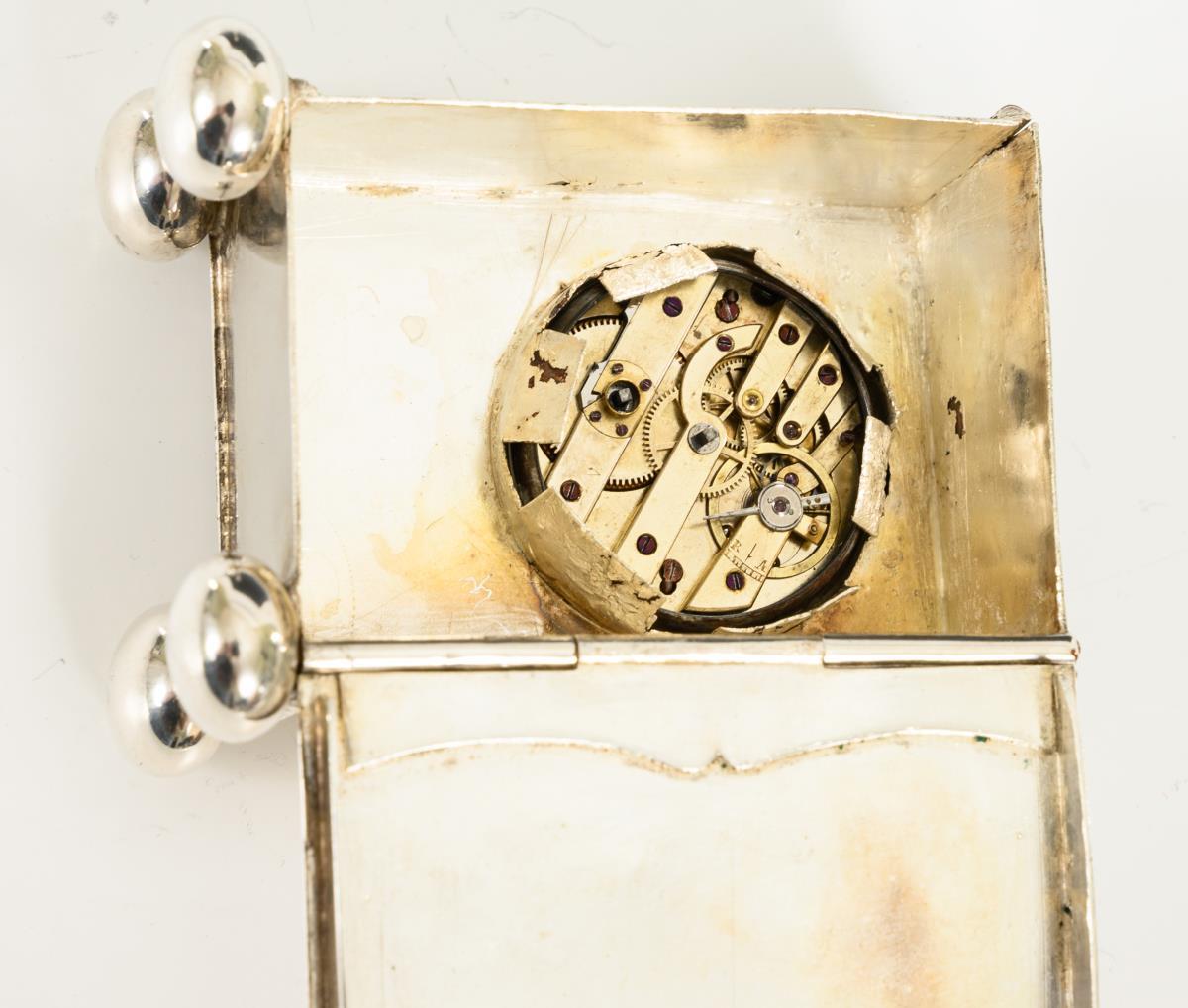 Miniature sterling silver grandfather clock (H 15.5 cm) and table clock with ball feet (H 9 cm). Several keys enclosed. Small dents and defects, dials cracked. Function not tested.