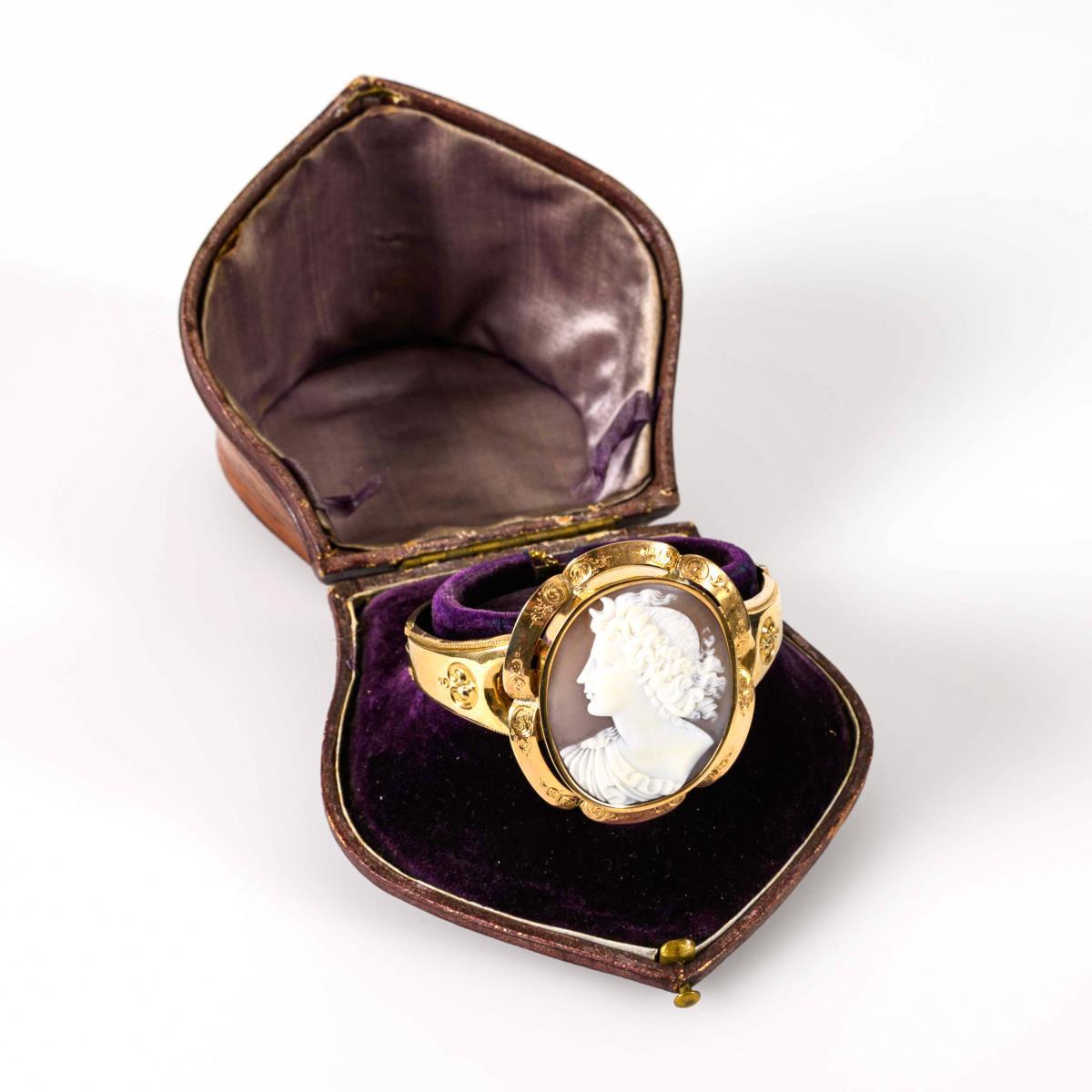Biedermeier bangle with large shell cameo, in original case.