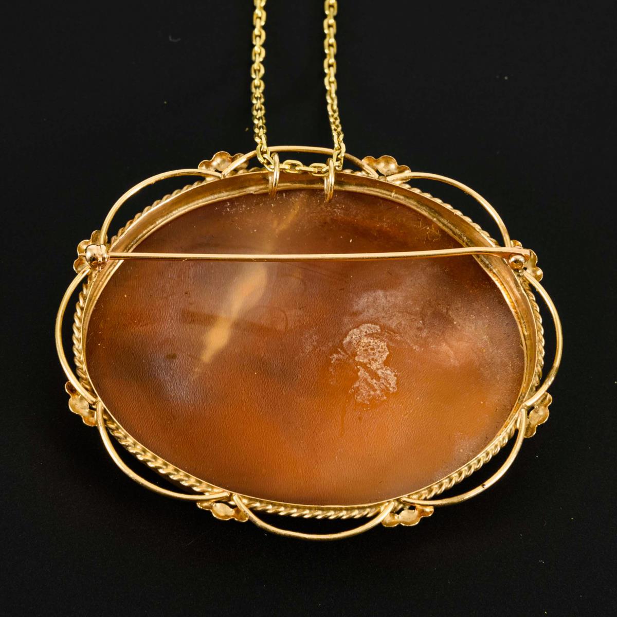 Tested yellow gold 585. Chain stamped. Brooch 6.7 x 5.6 cm. Chain L 70 cm. 23,4/10,0 g.