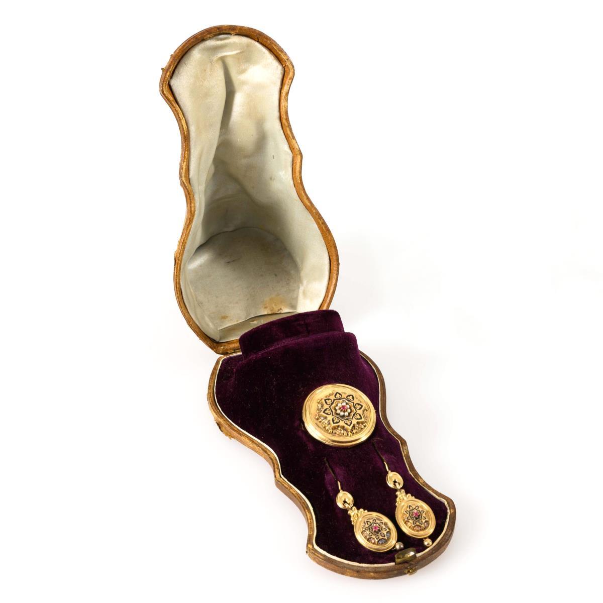 Pair of earrings of the same design with suspension hook. Original brown case without bangle. Brooch with traces of wear on the sides (small creases and dents).