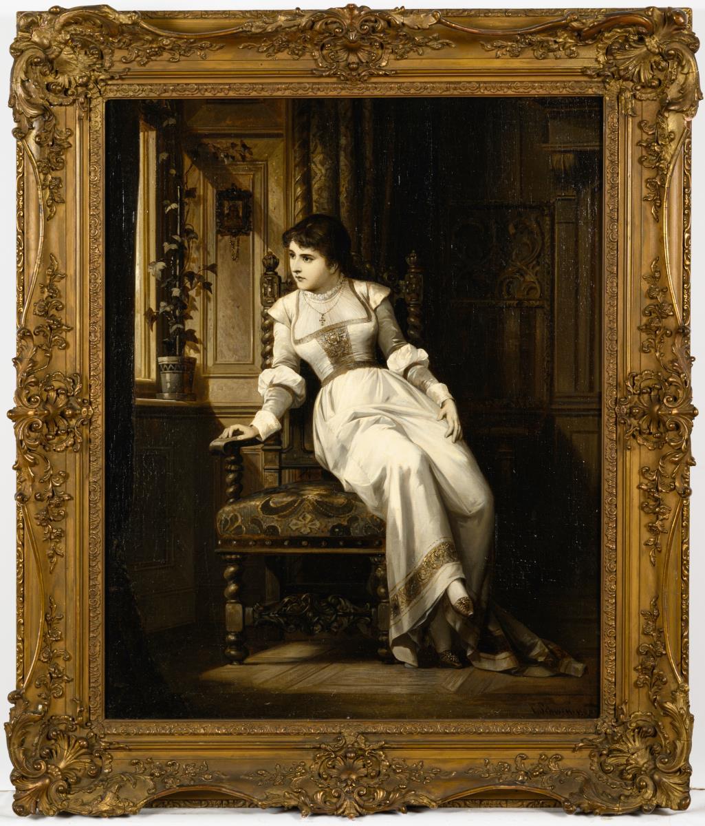 Young woman in a white dress on an armchair with a view out of the window. Restored with backing.
