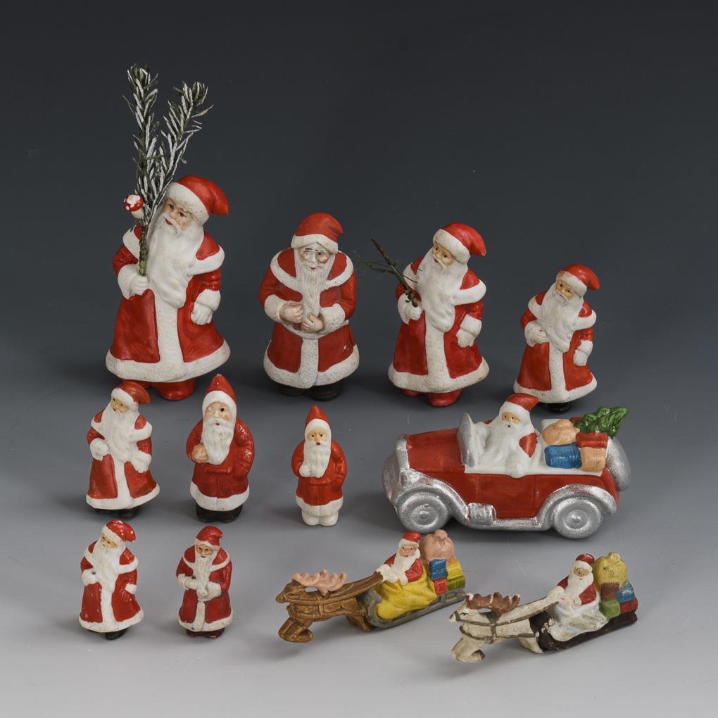 9 Santa Clauses, Santa Claus car and 2 Christmas sleighs. Parts with minimal color abrasion.
