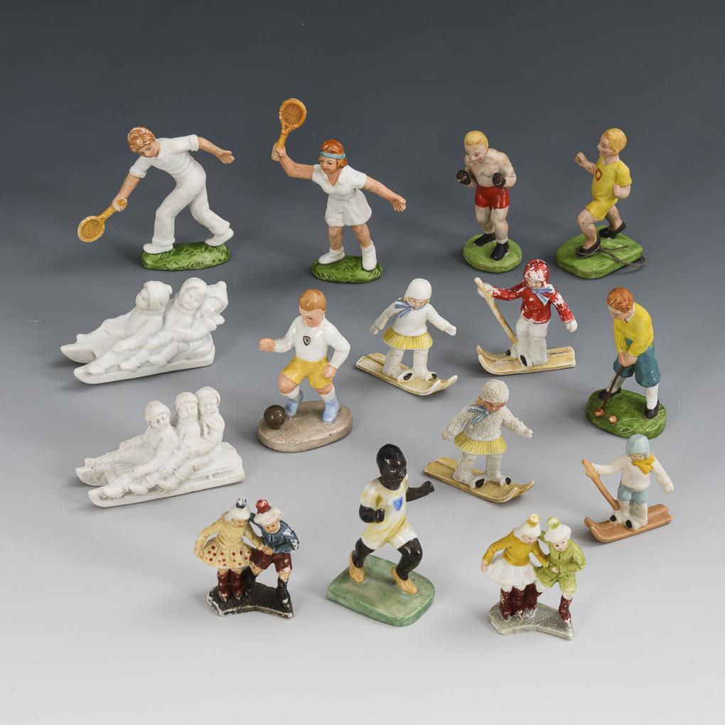 Miniature sports figures: including a black runner, presumably Jesse Owens (Olympic champion 1936), boxer, golfer, skier, tennis player and luger. Small defects, some paint rubbed off.