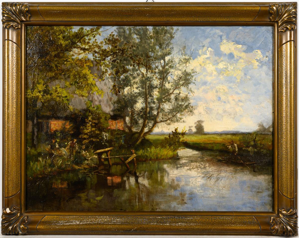 The small house on a canal between trees in the sunshine. Minimal traces of age.