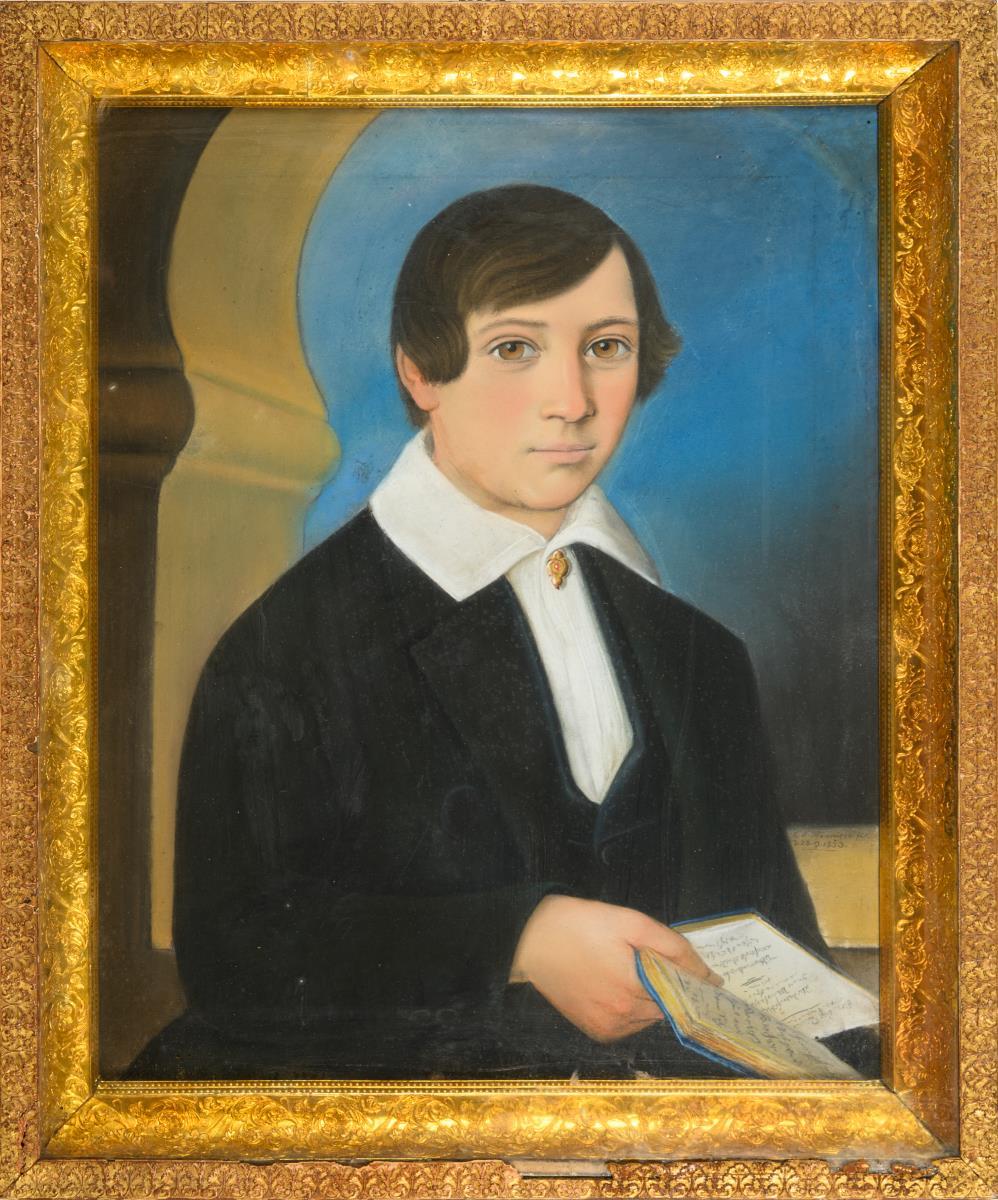 Portrait of a boy in a dark suit with a white shirt and a book.