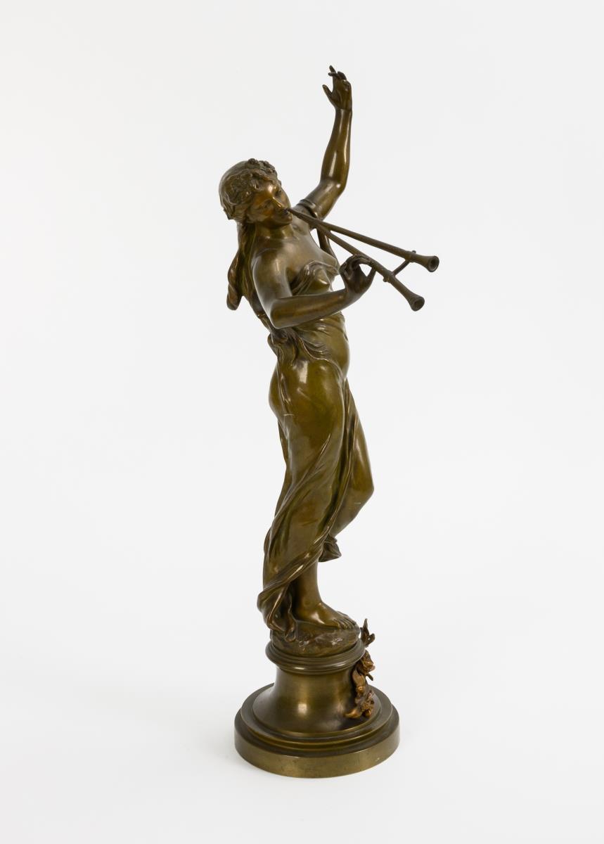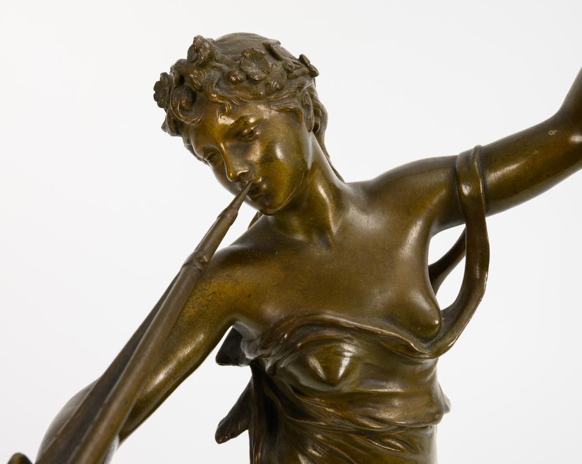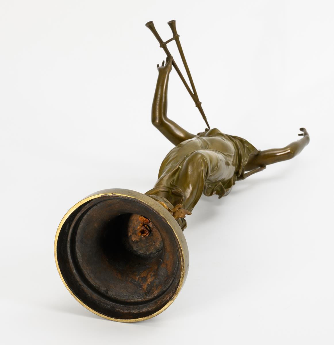 A young woman standing on a high bronze base with an appliquéd branch of flowers, playing music with her arms raised; probably an allegory of spring. Minimal signs of age/use.