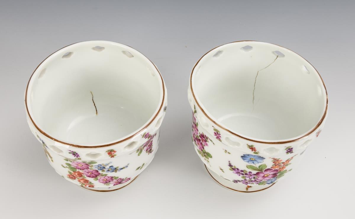 2x Marc Eugéne Bloch, Paris, 1868-1887: footed cachepot with pierced rim, relief decoration and flower painting (h 11.5 cm, Ø 11.5 cm). / 2x mark not recognizable, 2nd half 19th century: pair of brass candlesticks with faceted porcelain shaft (H 23.5 cm). Cachepots each with firing crack.