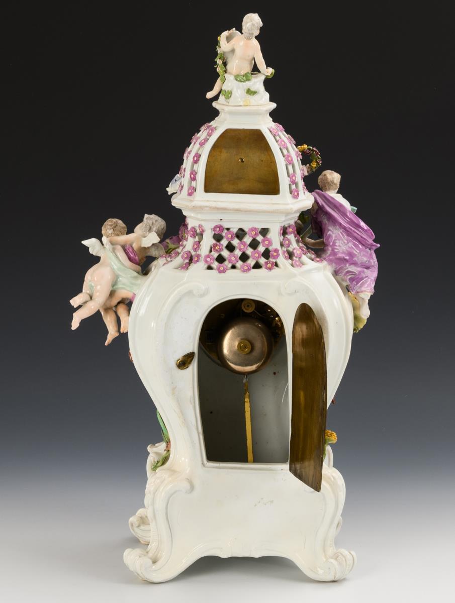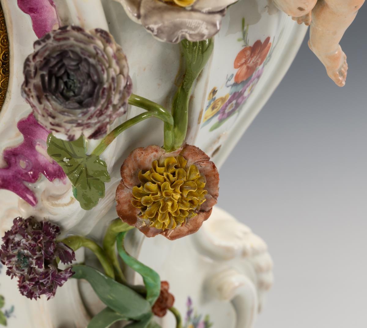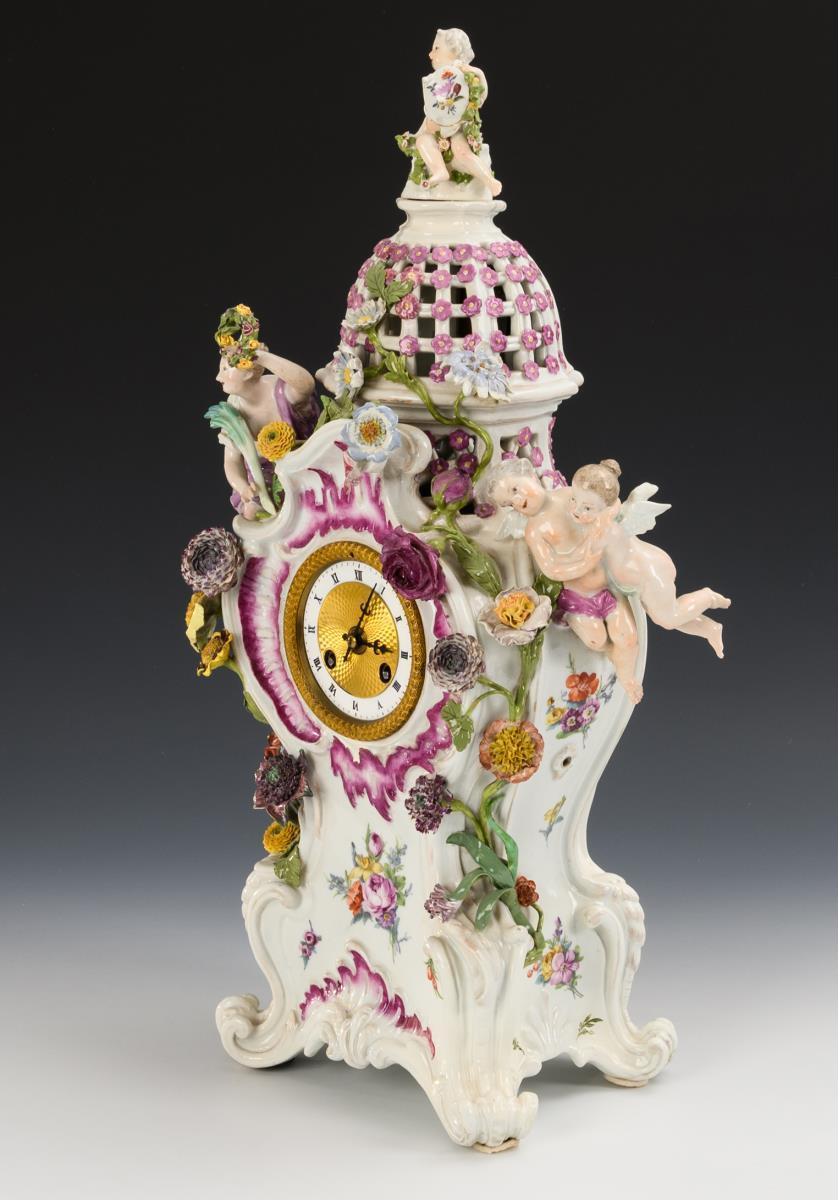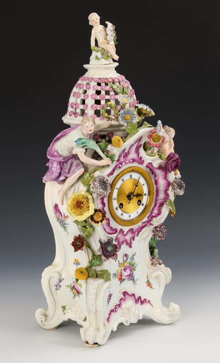Rocaille chandelier with rocaille relief, floral covering, latticework dome and a putto with flower garland and shield as decoration. On the shoulder of the case is a female figure with a wreath of flowers and a pair of embracing putti, with flower painting on the panels. Clock with enamel dial, mixed numerals, guilloché brass leaf, half-hour strike on bell and pendulum; runs on. Restored, flowers and leaves somewhat bumped in places.