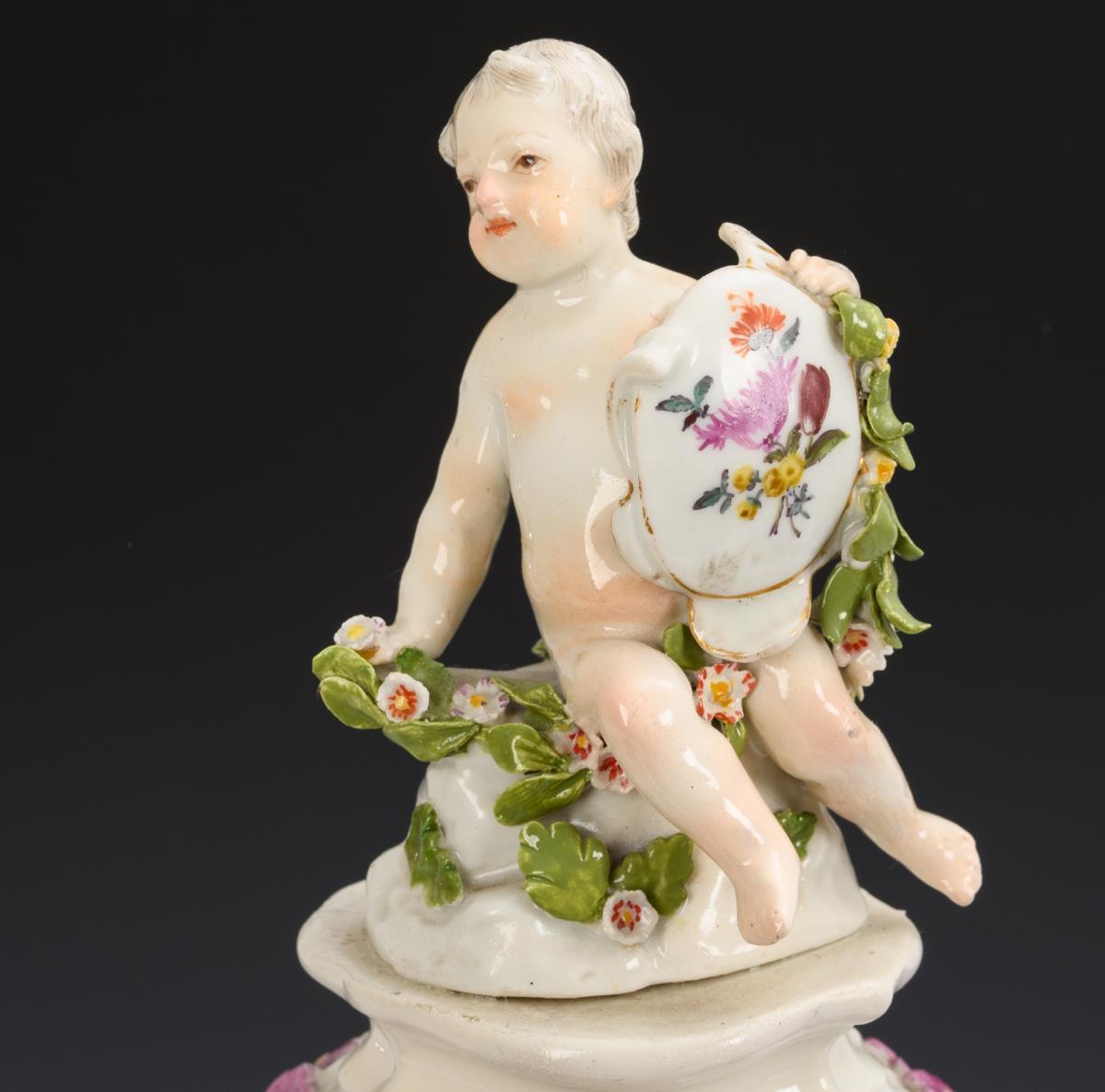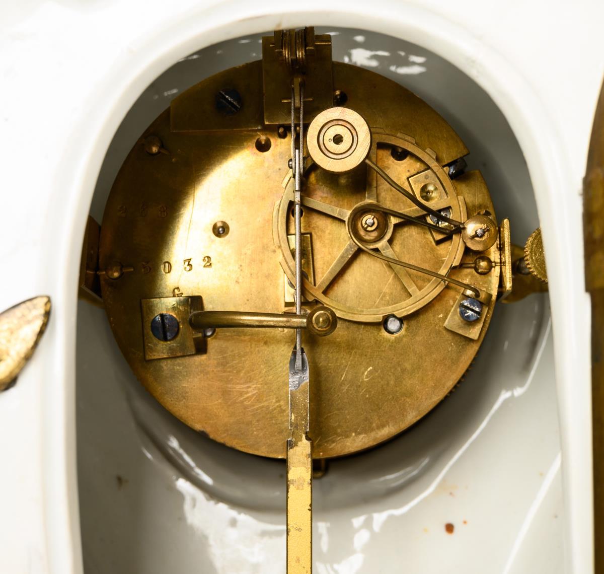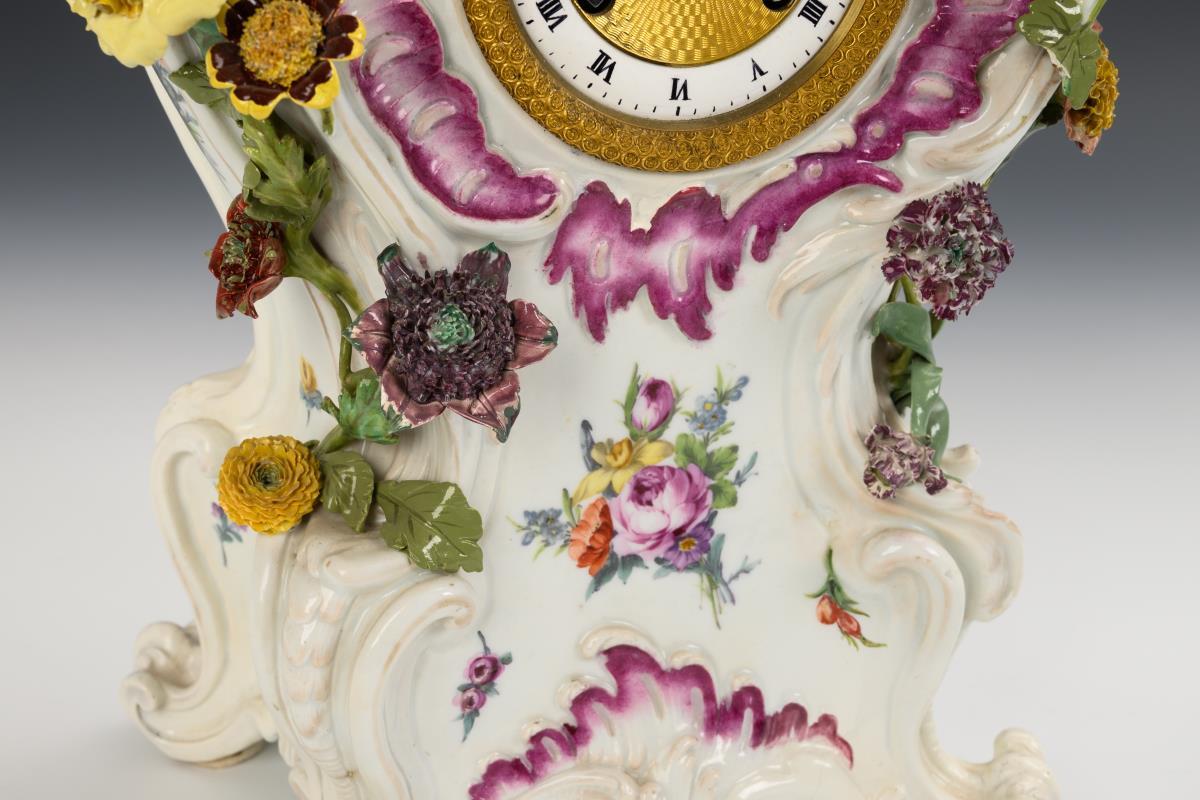 Rocaille chandelier with rocaille relief, floral covering, latticework dome and a putto with flower garland and shield as decoration. On the shoulder of the case is a female figure with a wreath of flowers and a pair of embracing putti, with flower painting on the panels. Clock with enamel dial, mixed numerals, guilloché brass leaf, half-hour strike on bell and pendulum; runs on. Restored, flowers and leaves somewhat bumped in places.