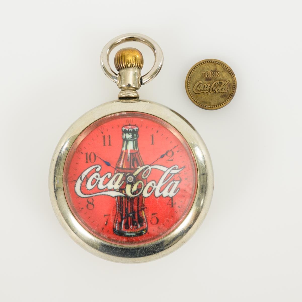 Coca Cola advertising pocket watch and Coca Cola vending machine coin. American Waltham Watch Co.