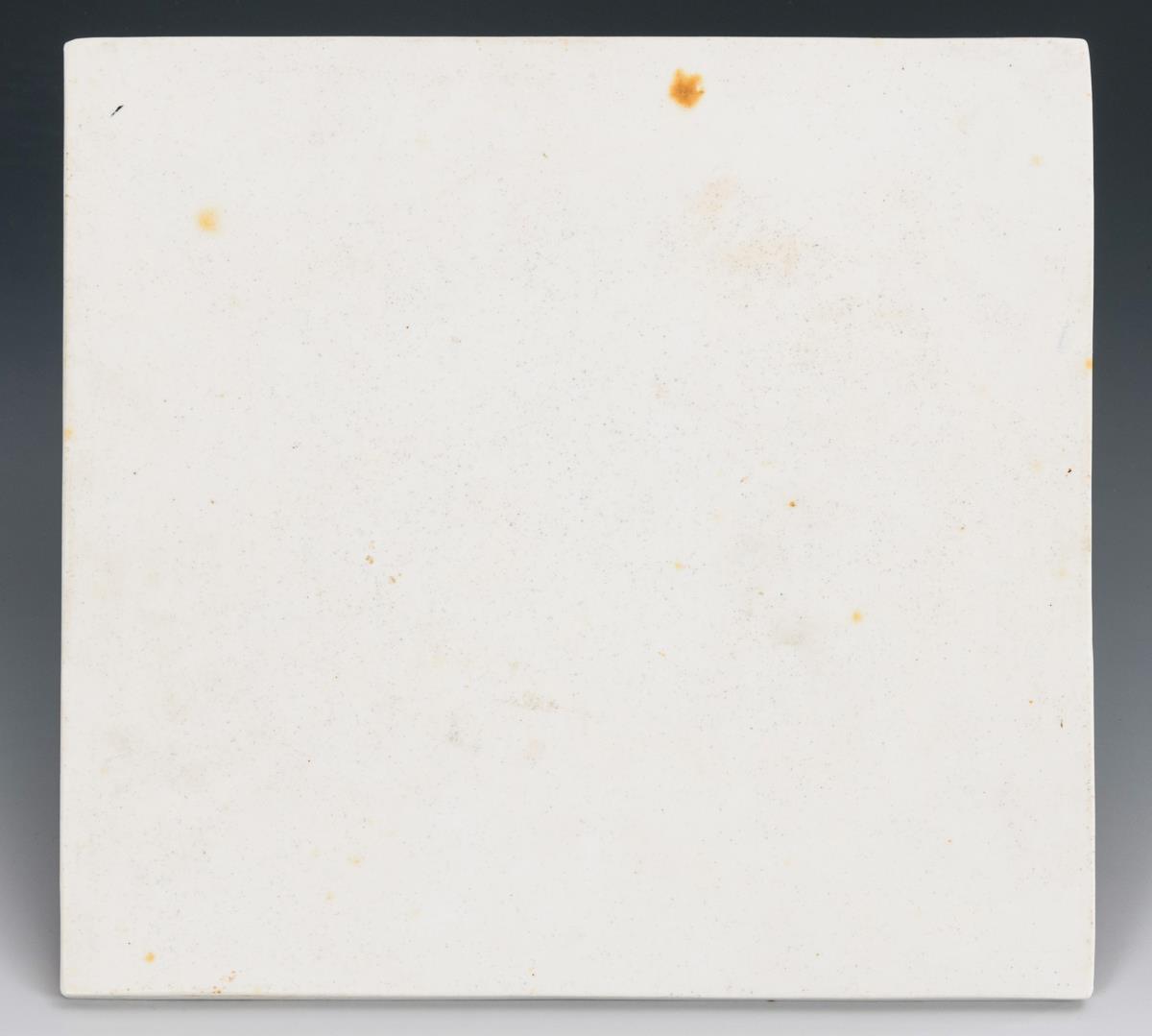 Quadratische Platte mit der Darstellung eines an einem Blumenkorb mit Rosen, Flieder, Tulpe und Narzissen sitzenden Vogels.