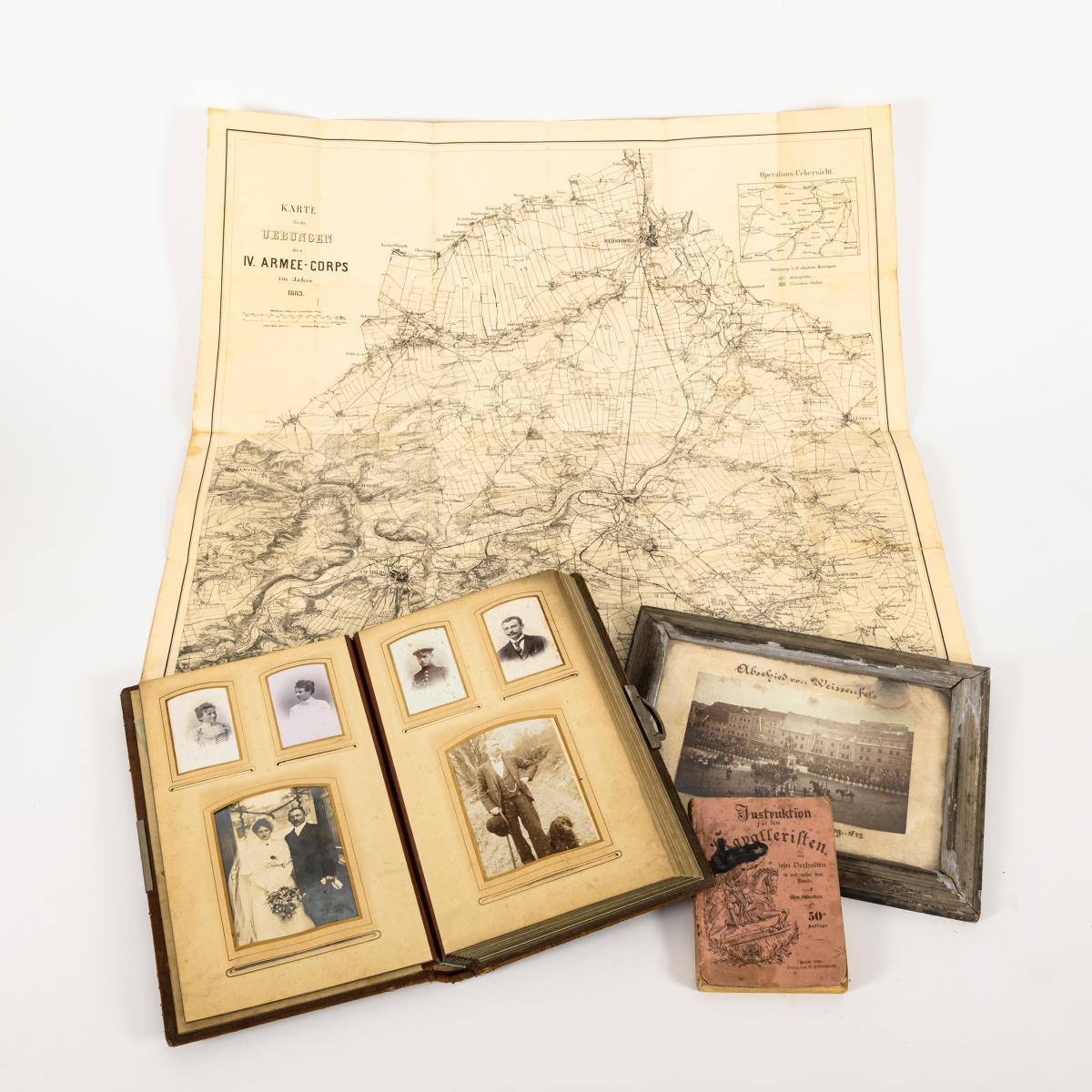 Framed photo: "Abschied von Weissenfels, der 1. und 2. Esc. Thür. Hus.Reg. Nr. 12, am 29. März 1901" / Photo album with approx. 47 portrait photos, including many military personnel from different branches of the armed forces. Also a Zeppelin photo and 8 postcards, 1 letter. In an embossed leather album / Book: "Instruktion für den Kavalleristen über sein Verhalten in und außer dem Dienste", Berlin 1898, 287 pages. / "Karte für die Uebung des IV. Armee-Corps im Jahre 1883", folded. All parts with stronger signs of age or use.