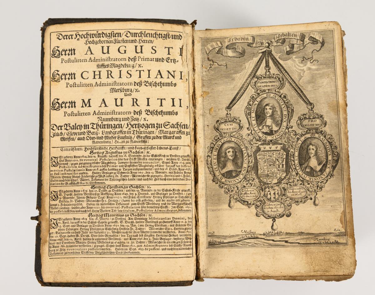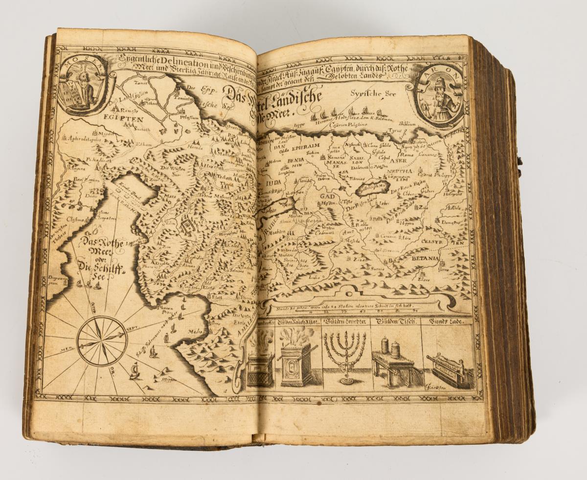 Bible in German, two columns with several engravings, plates and maps. Title copper, title page, (2), portraits of the 2 Saxon dukes, (108), pages, copper, 336 leaves, 226 leaves, (21) leaves appendix or addition of three books (Ezra and Maccab.), 159 leaves. In leather binding with embossed edges. clasps missing, spine torn. The last page and a calendar page at the beginning are probably missing. Not collated.