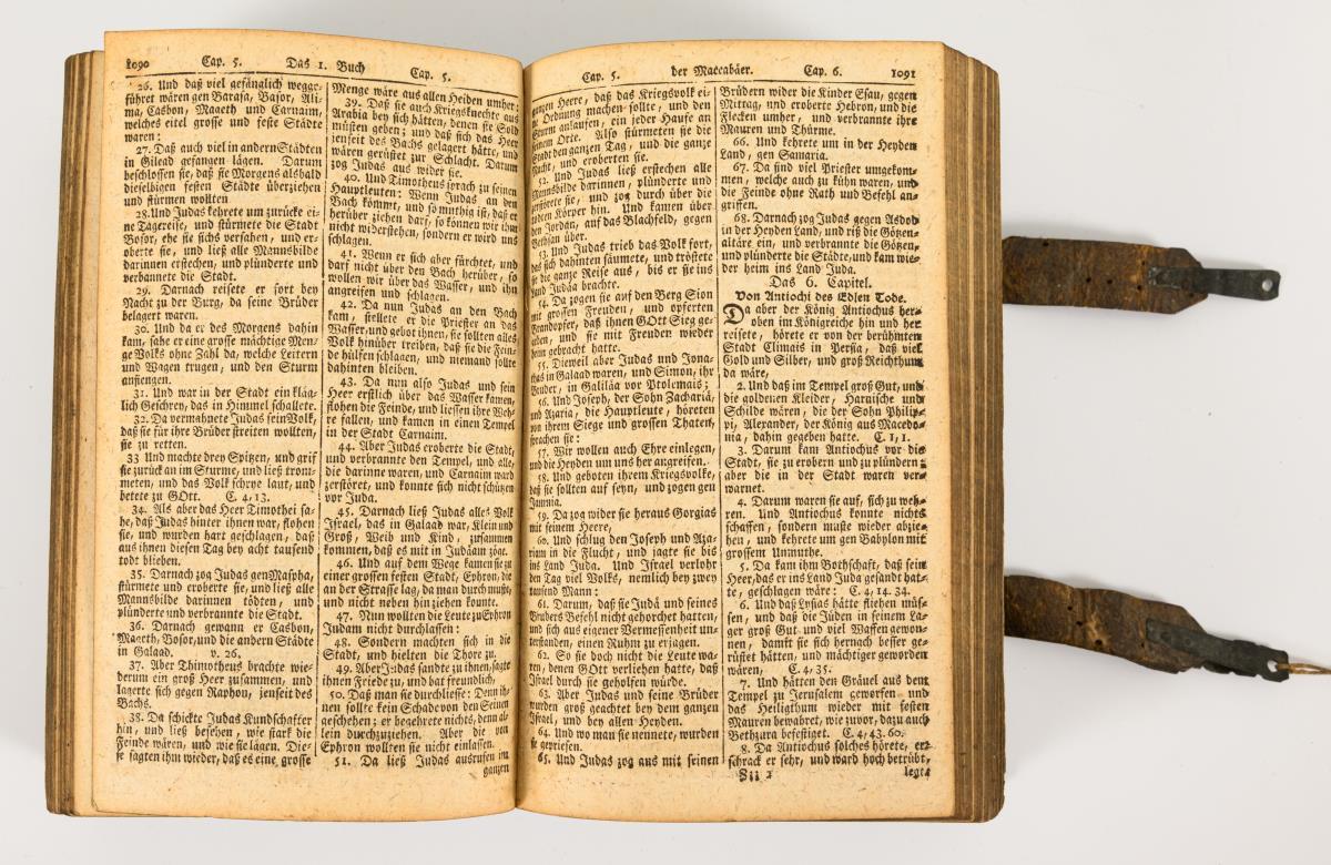 With a preface by D. Siegfried Beck. Title copper loose, title, (28), 1152, 316, (4) pages. "Geistliches neuvermehrtes Altenburgisches Gesang- und Gebetbuch", "Preface by Carl Andreas Redels. Altenburg 1795. 1516 columns, (36 pages), 128 columns. Leather binding cracked, spine defective. Clasps too short, but binding tight.