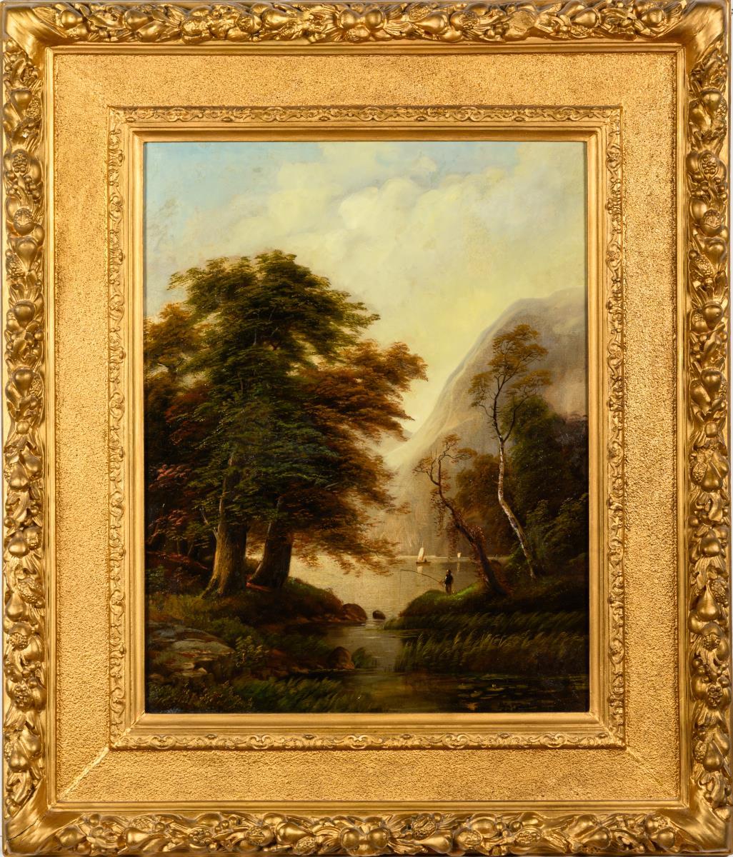 Angler on the shore of a lake in the mountains with sailors in front of the steeply rising mountains. Doubled canvas.