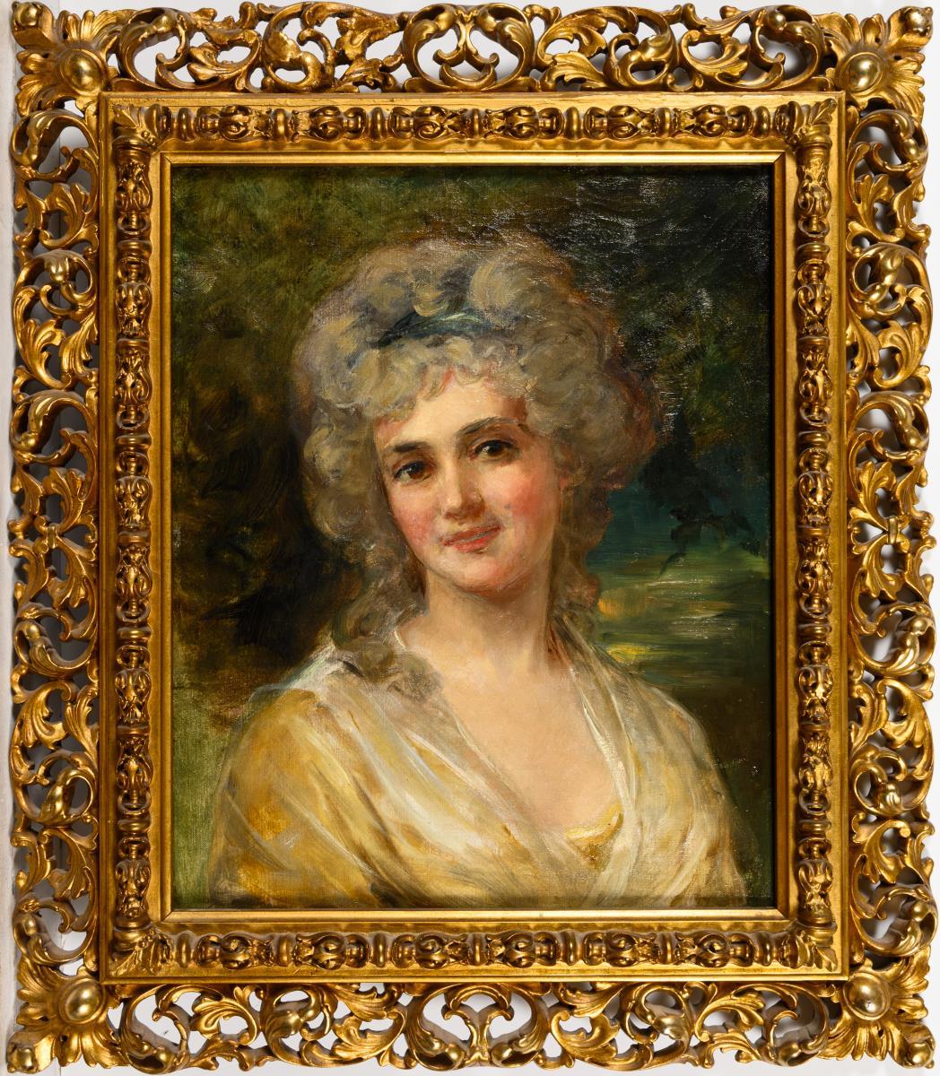 Portrait of a young woman in the fashion of the late 18th century. Restored with backing.