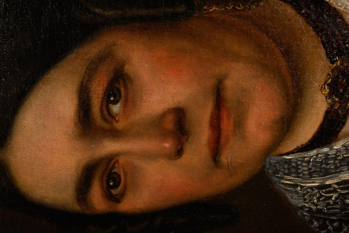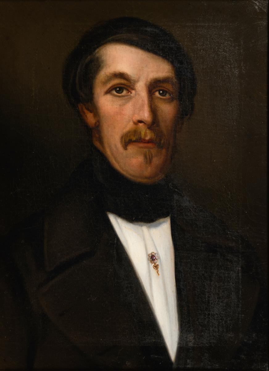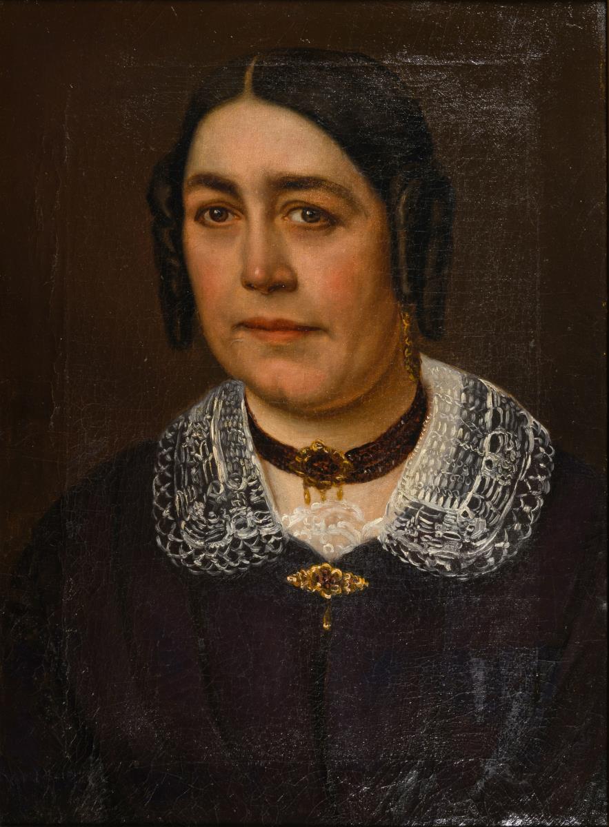 Portrait of a young woman with gold jewelry and in a purple dress and portrait of a man in a dark suit with a white shirt. Slight traces of age.