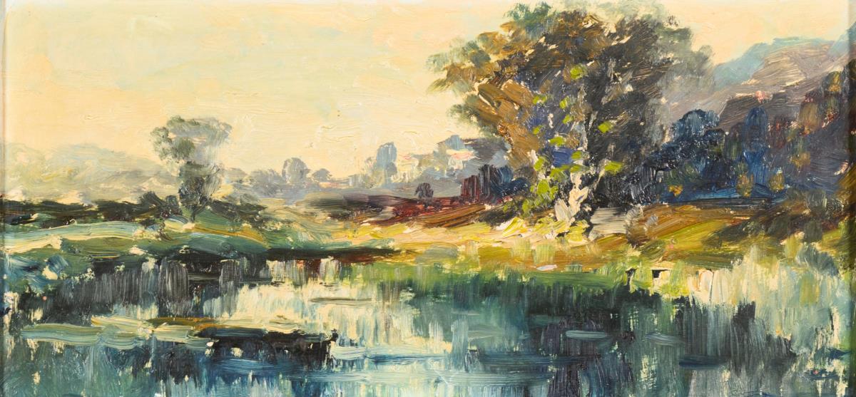 Impressionistically painted lakeshore with trees in front of a mountain range.