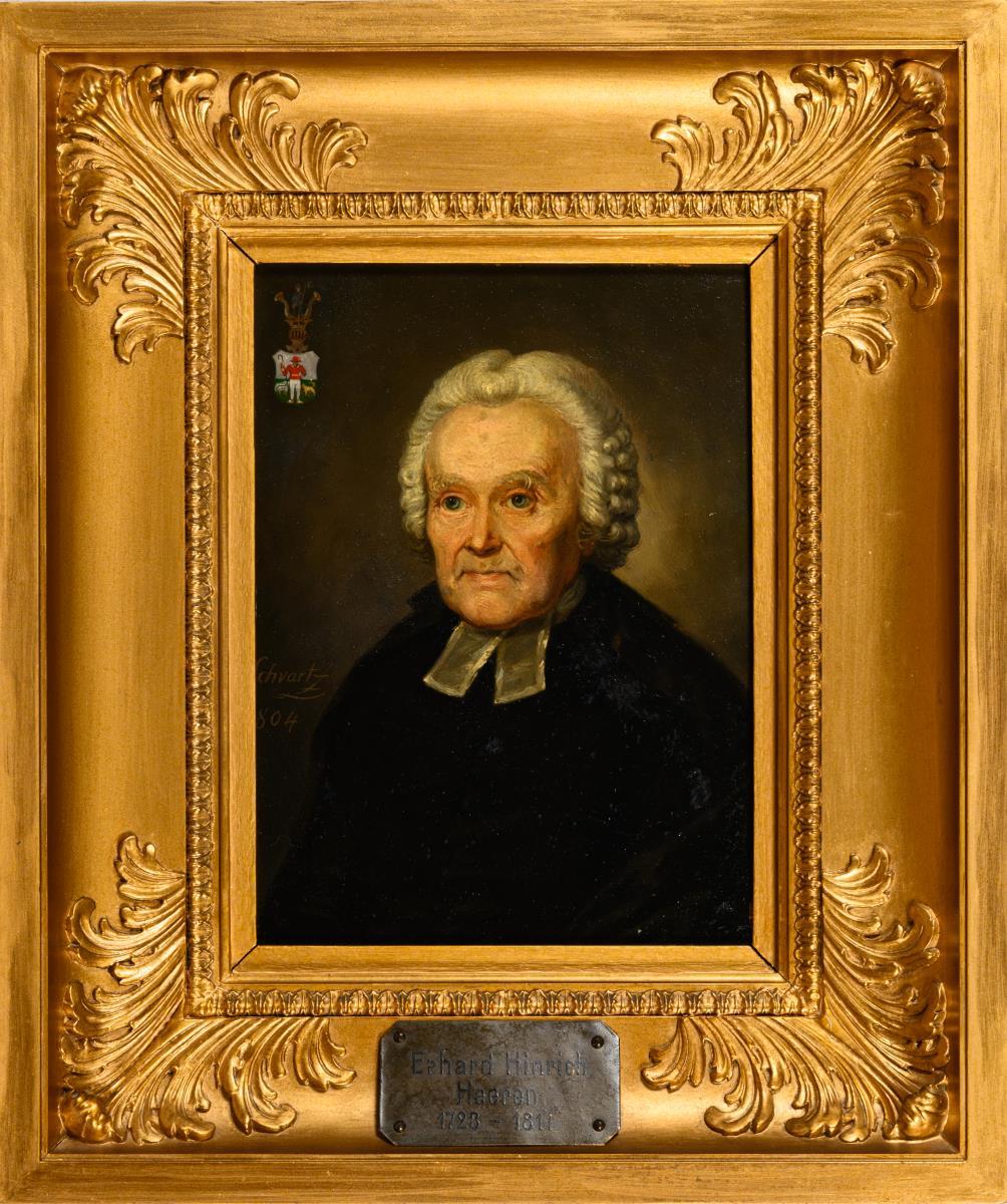 Portrait of the cathedral preacher in Bremen in black regalia with white plaited wig. Slight traces of age.
